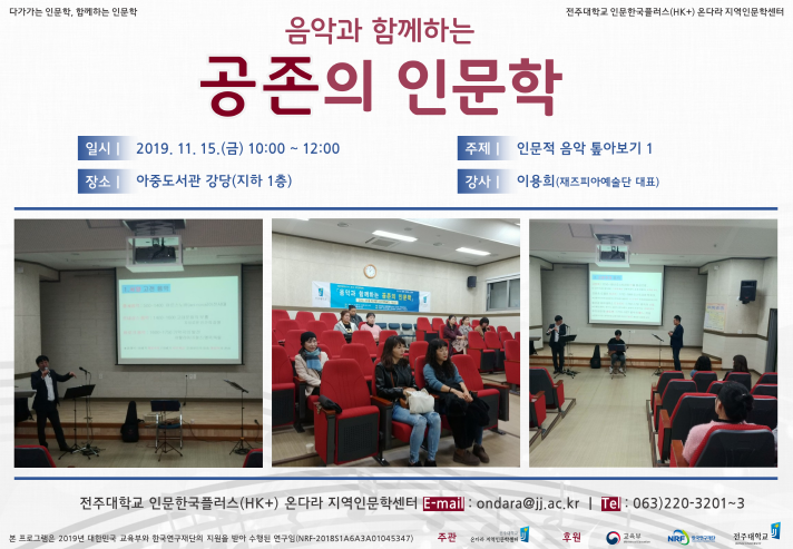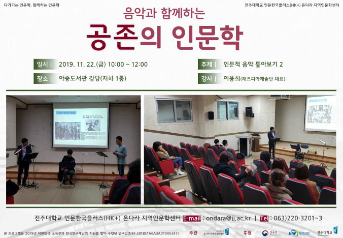 | 172 | 기타 | 음악과 함께하는 『공존의 인문학』 1차 (2019. 11. 15.) | 온다라 지역인문학센터 | 19-12-24 | 831 |