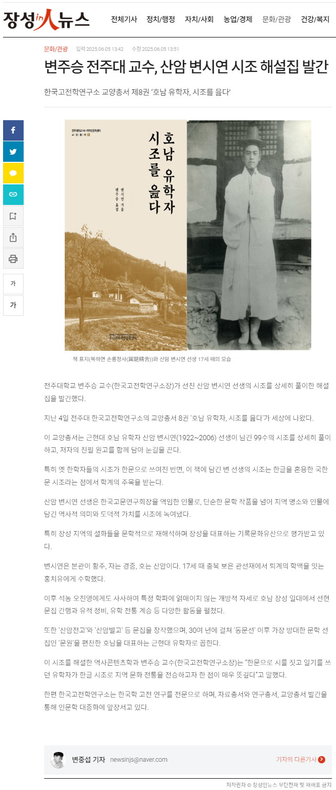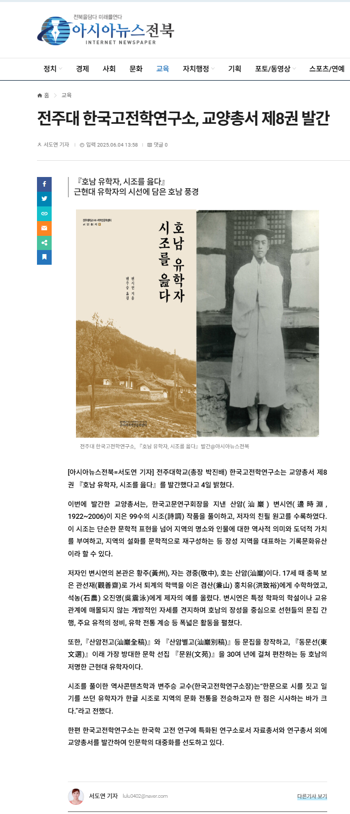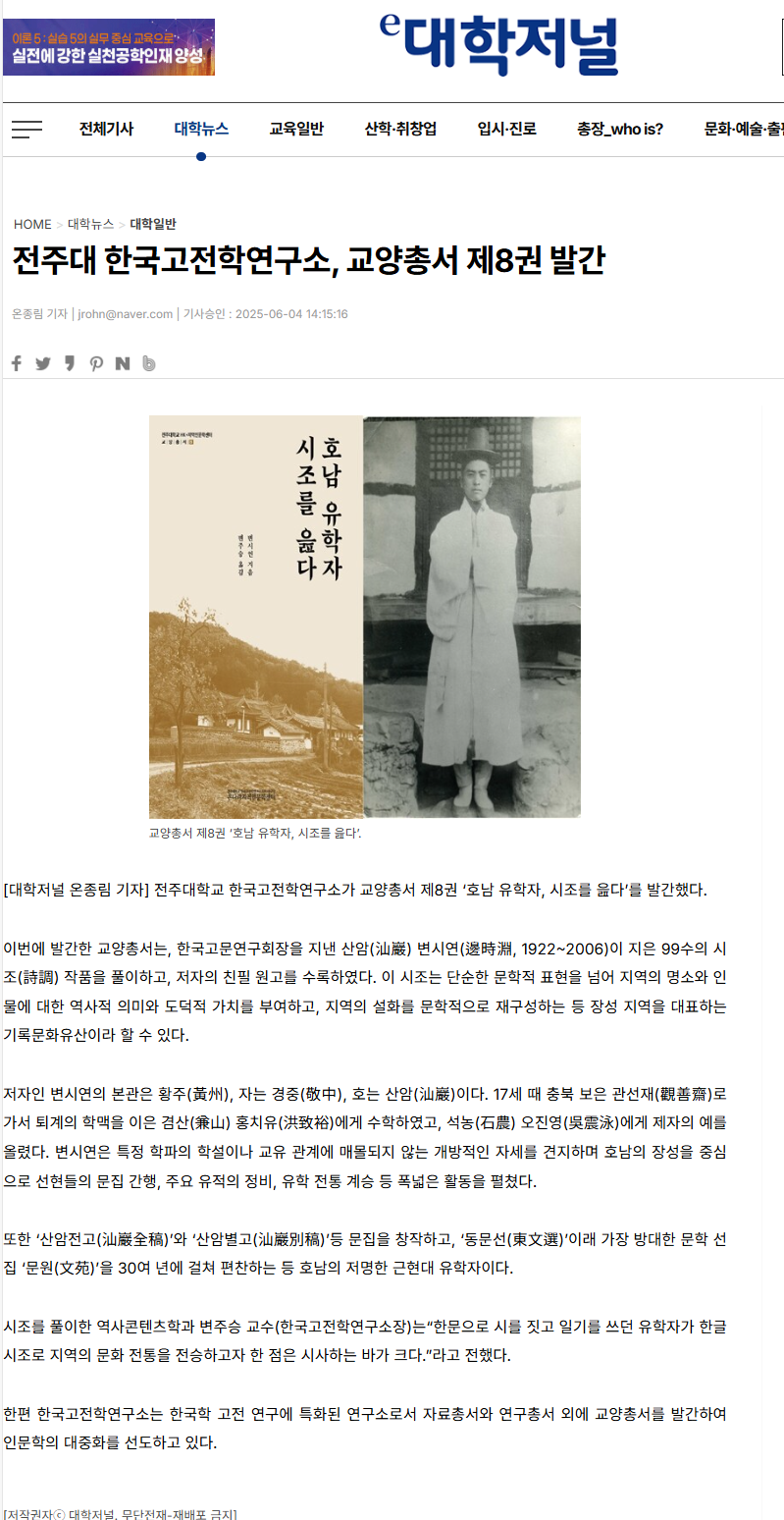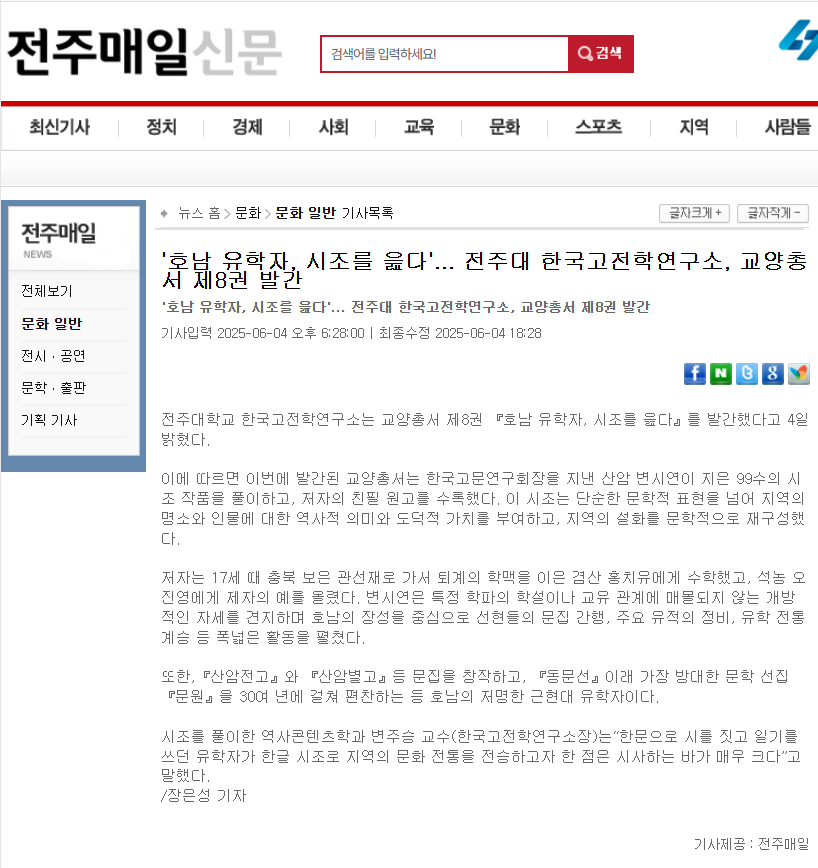 | [교양총서] 전주대 온다라 지역인문학센터, 교양총서 제8권 "호남 유학자, 시조를 읊다" 발간 |
