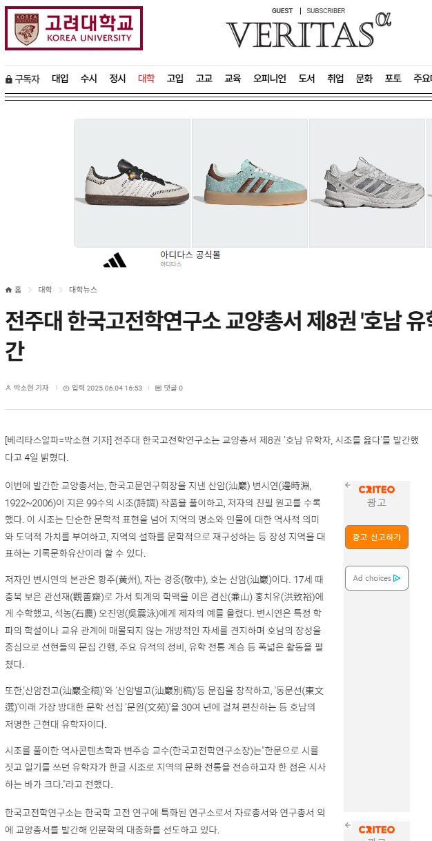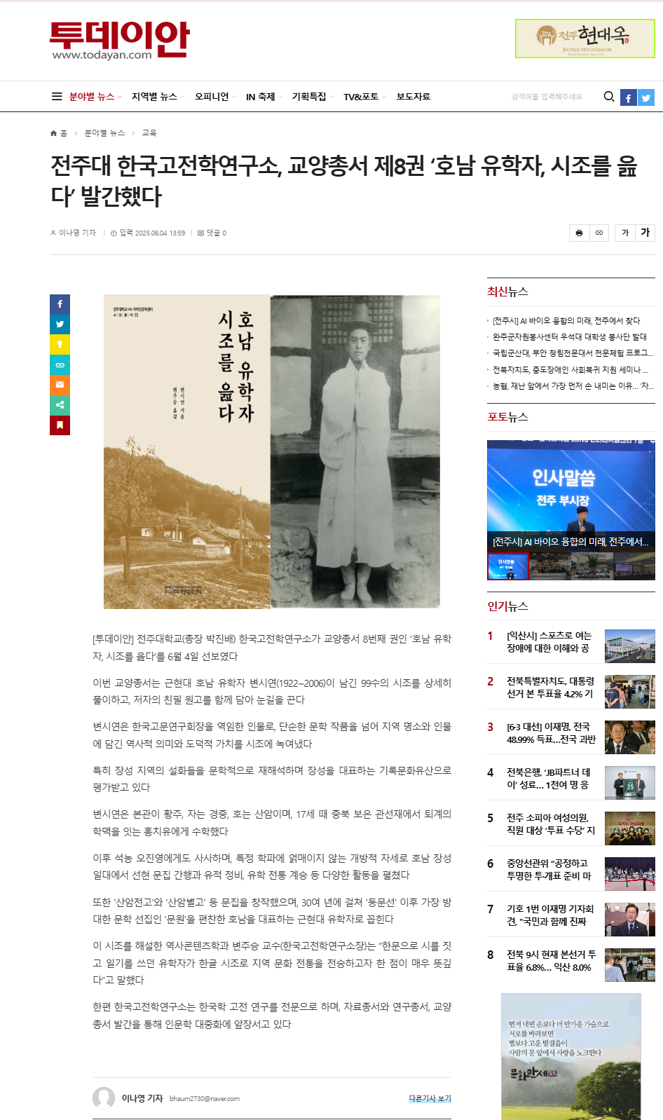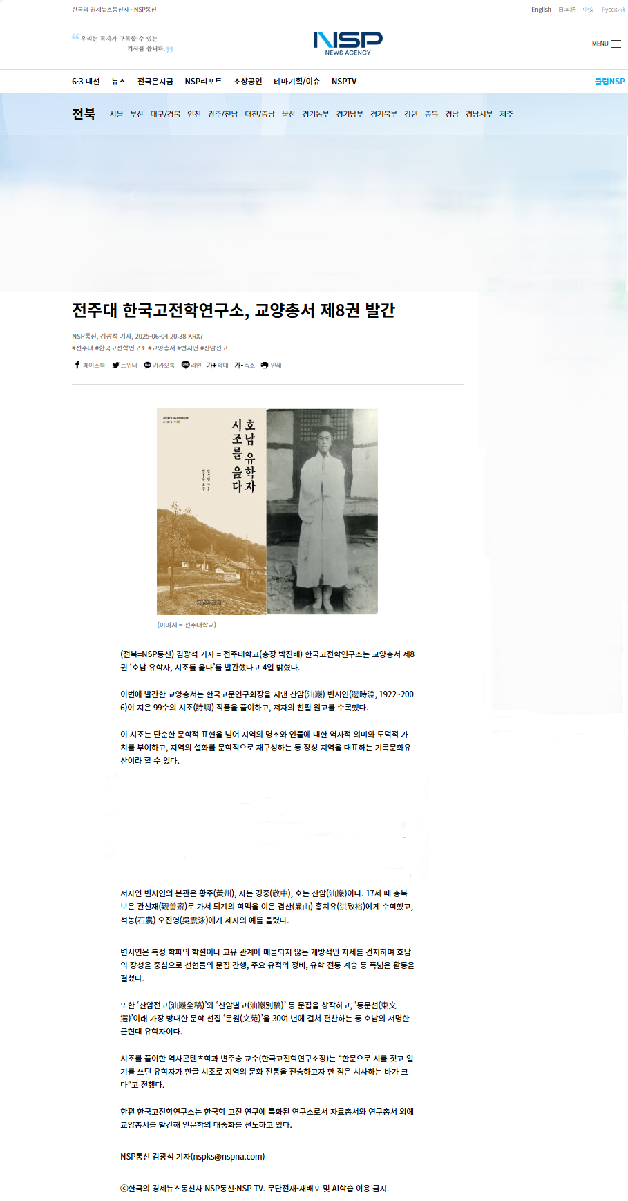 | [교양총서] 전주대 온다라 지역인문학센터, 교양총서 제8권 "호남 유학자, 시조를 읊다" 발간 |