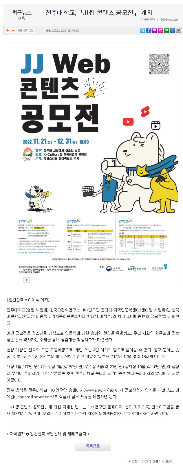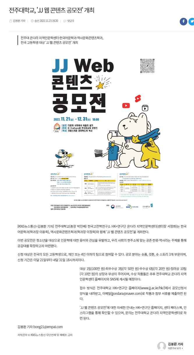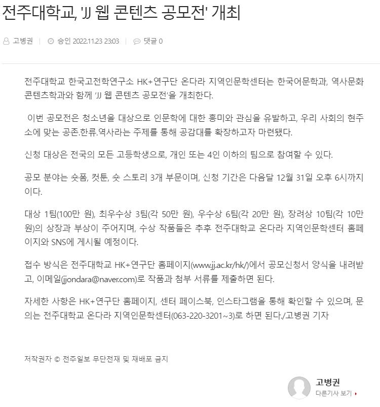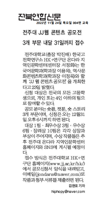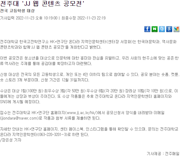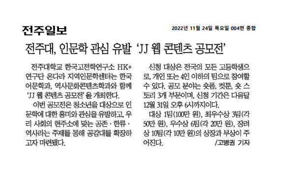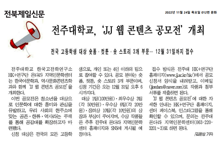 | 634 | 기타 | 전주대 'JJ 웹 콘텐츠 공모전' 3개 부문 내달 31일까지 접수 | 온다라 지역인문학센터 | 22-12-28 | 218 |