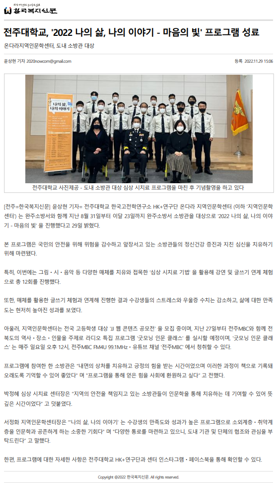| 638 | 기타 | 전주대학교, '2022 나의 삶, 나의 이야기-마음의 빛' 프로그램 성료 | 온다라 지역인문학센터 | 22-12-28 | 210 |