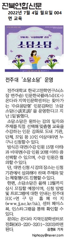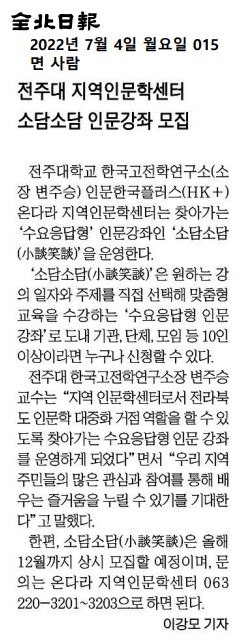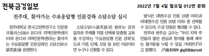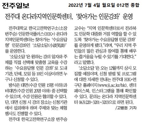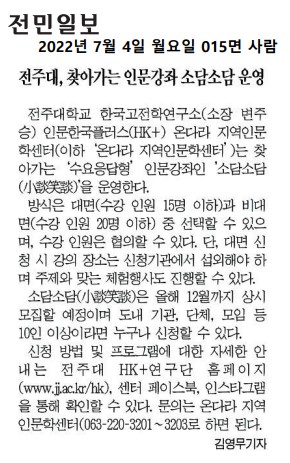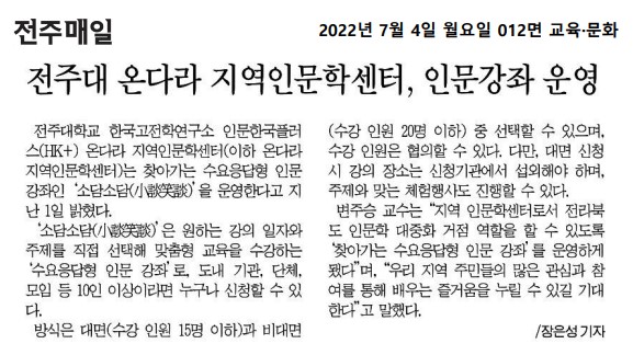 | 576 | 기타 | 전주대, 찾아가는 수요응답형 인문강좌 소담소담 실시 | 온다라 지역인문학센터 | 22-08-17 | 204 |