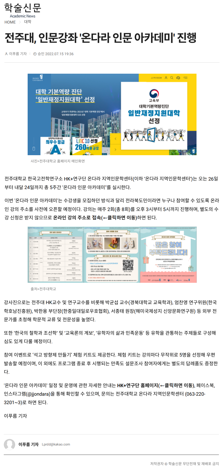 | 578 | 기타 | 온다라 인문 아카데미 실시 전주대, 26일부터 총 5주간 | 온다라 지역인문학센터 | 22-08-17 | 205 |