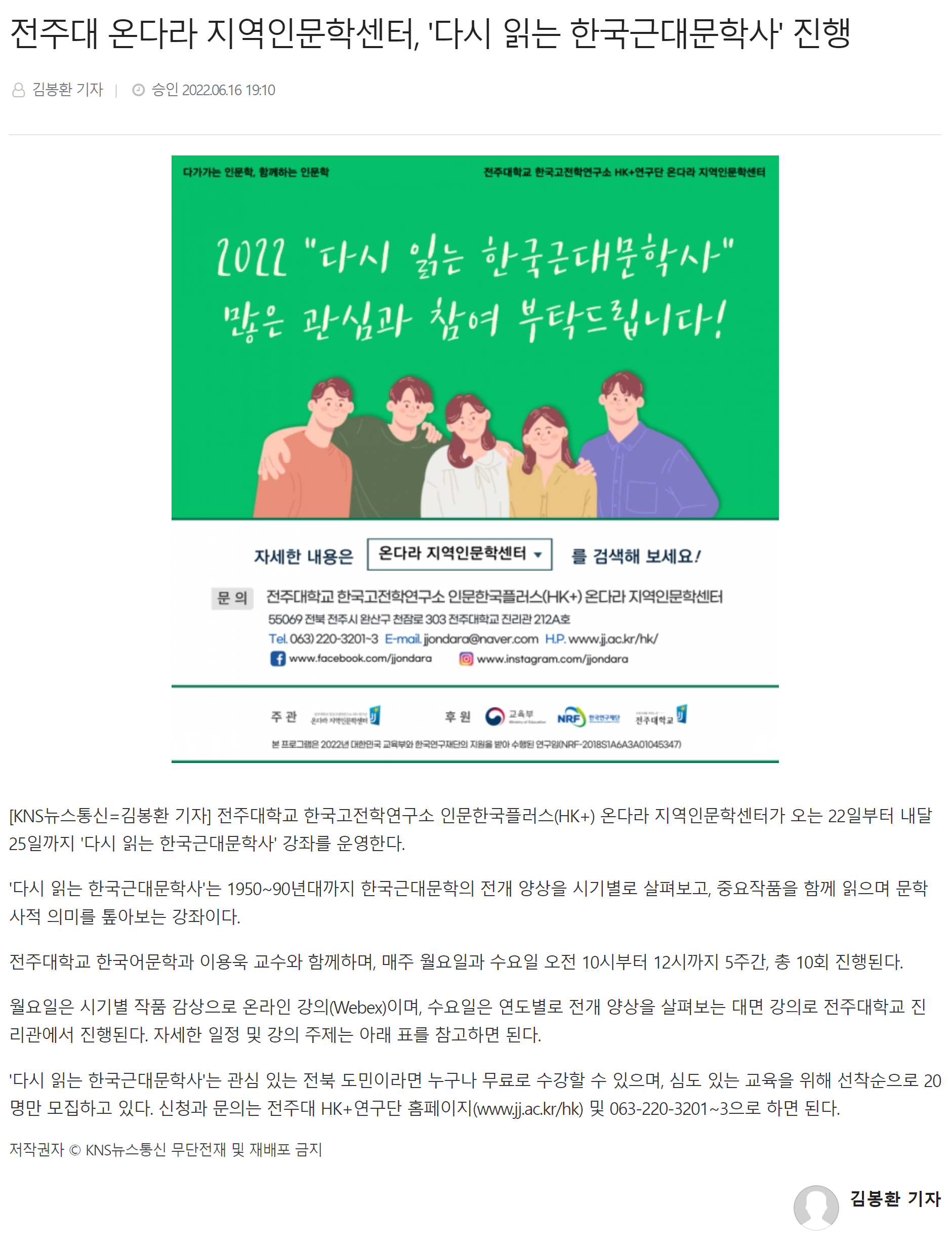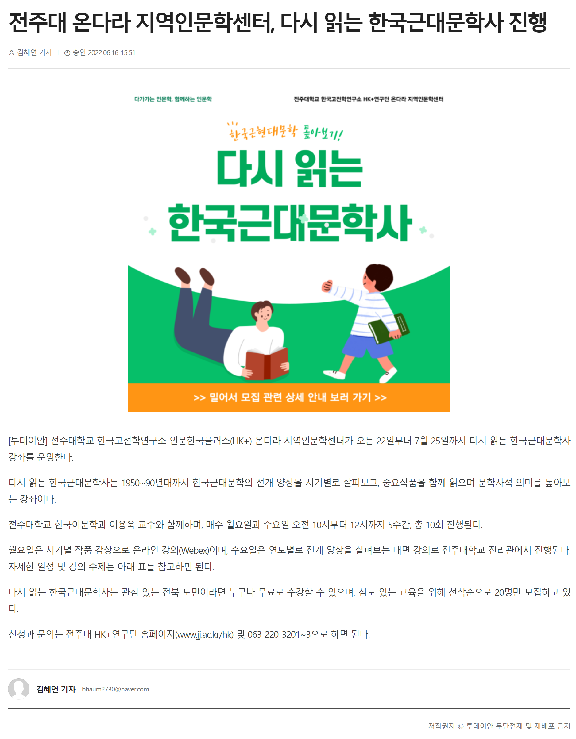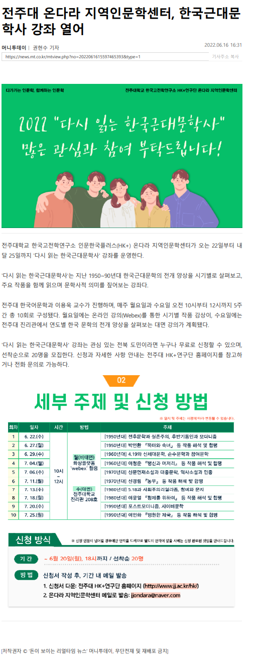 | 541 | 기타 | 전주대 온다라 지역인문학센터, 한국근대문학사 강좌 열어 | 온다라 지역인문학센터 | 22-06-30 | 189 |