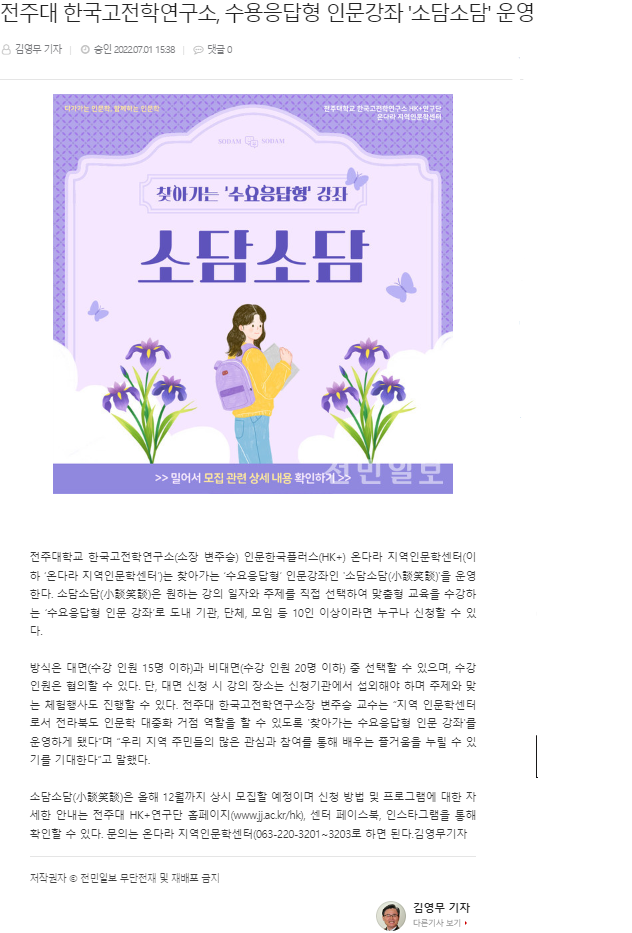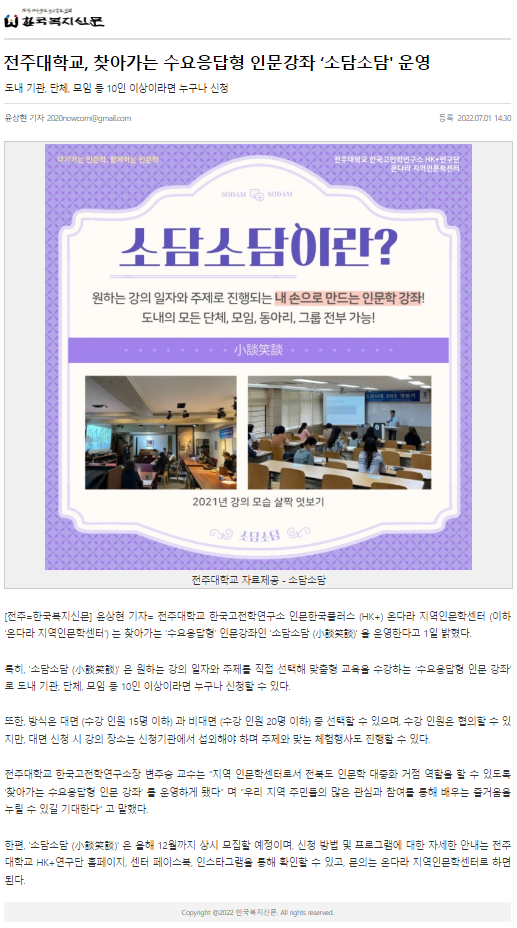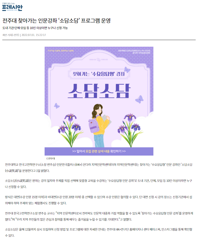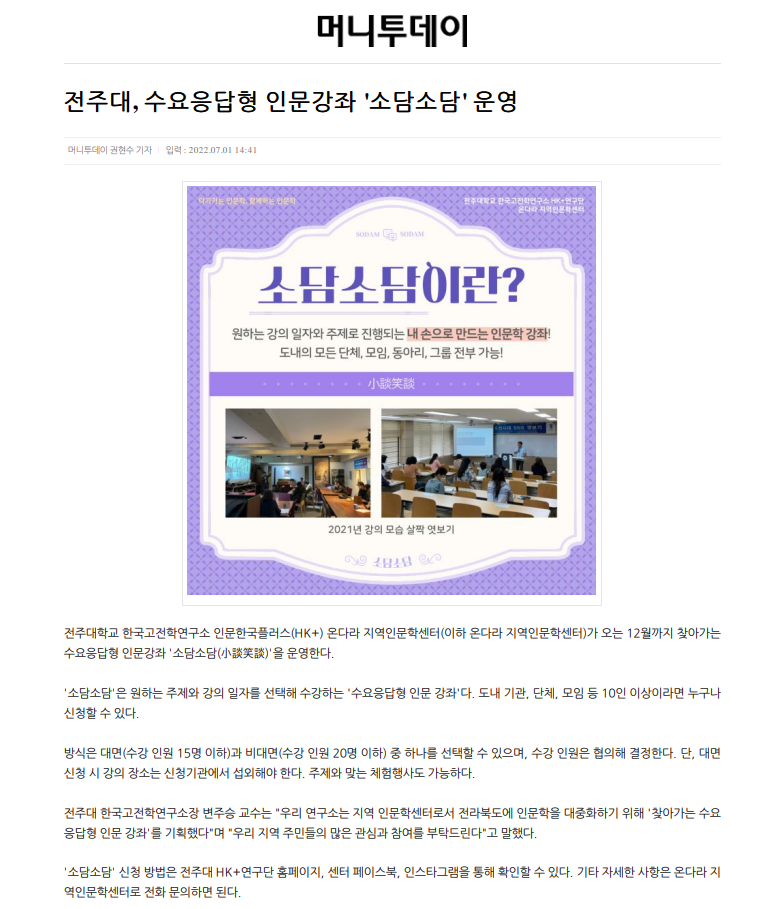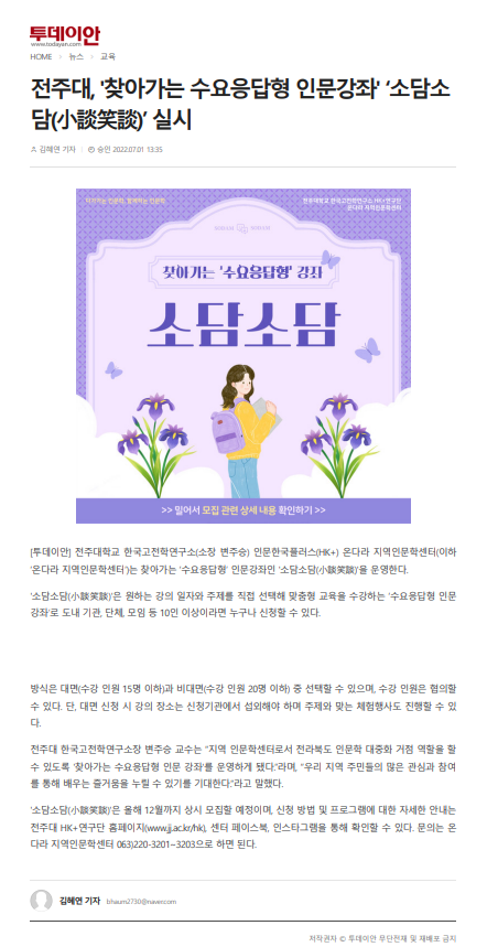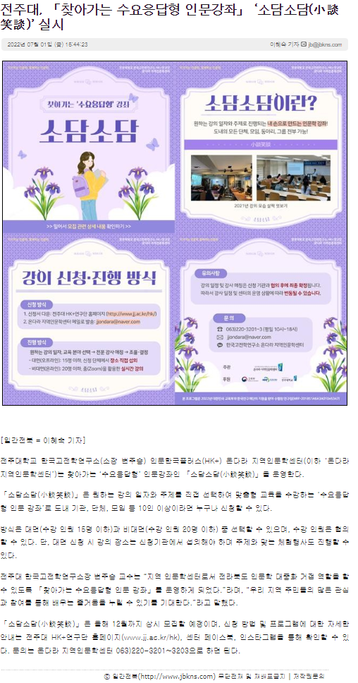 | 547 | 기타 | 전주대학교, 찾아가는 수요응답형 인문강좌 ‘소담소담' 운영 | 온다라 지역인문학센터 | 22-07-04 | 194 |