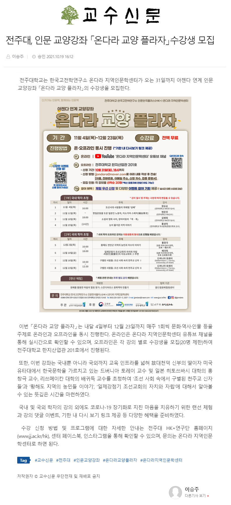 | 461 | 기타 | 전주대, 인문 교양강좌 「온다라 교양 플라자」수강생 모집 | 온다라 지역인문학센터 | 21-10-20 | 213 |
