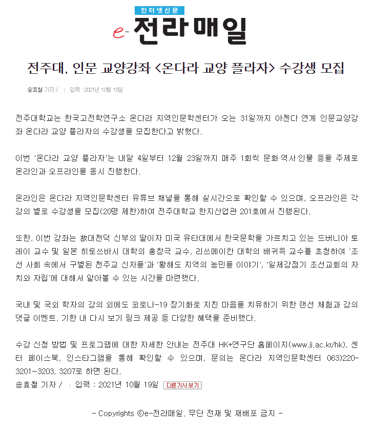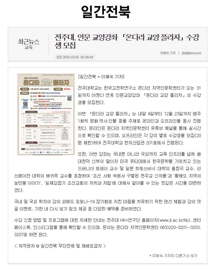 | 463 | 기타 | 전주대, 인문 교양강좌 온다라 교양 플라자 수강생 모집 | 온다라 지역인문학센터 | 21-10-20 | 232 |