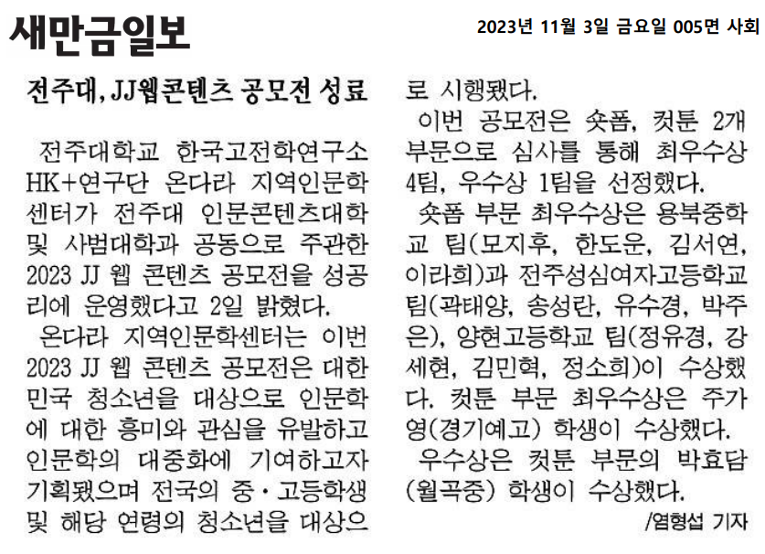 | 721 | 기타 | 전주대, 인문학 대중화 박차 2023 JJ 웹 콘텐츠 공모전 성료 | 온다라 지역인문학센터 | 23-11-14 | 287 |