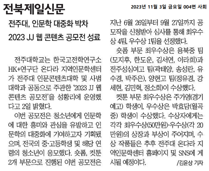 전주대, 인문학 대중화 박차 2023 JJ 웹 콘텐츠 공모전 성료