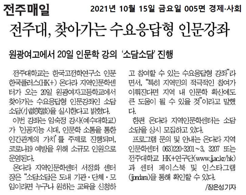 | 449 | 기타 | 전주대, 찾아가는 수요응답형 인문강좌 | 온다라 지역인문학센터 | 21-10-20 | 202 |