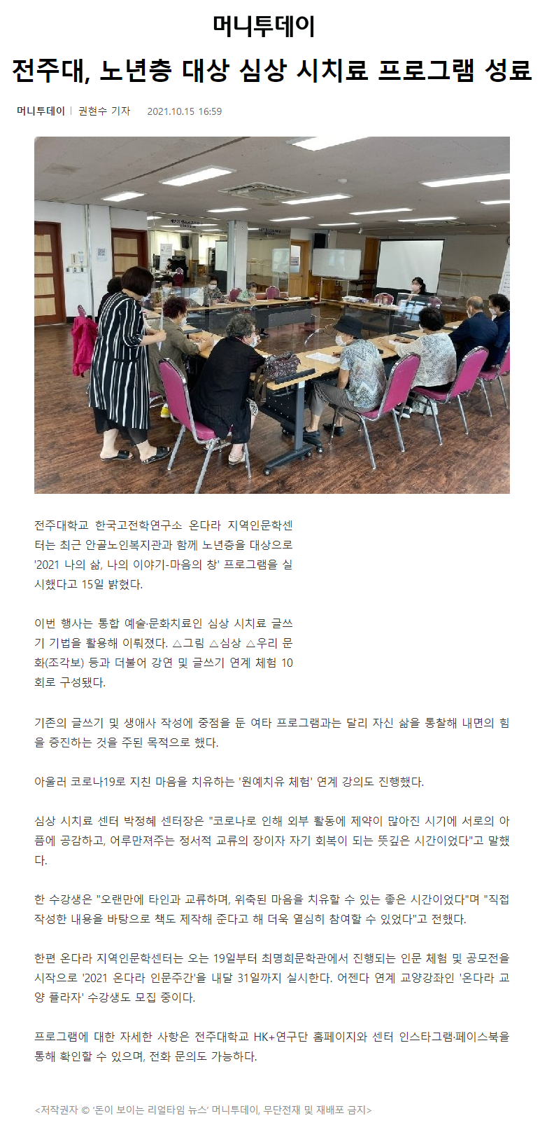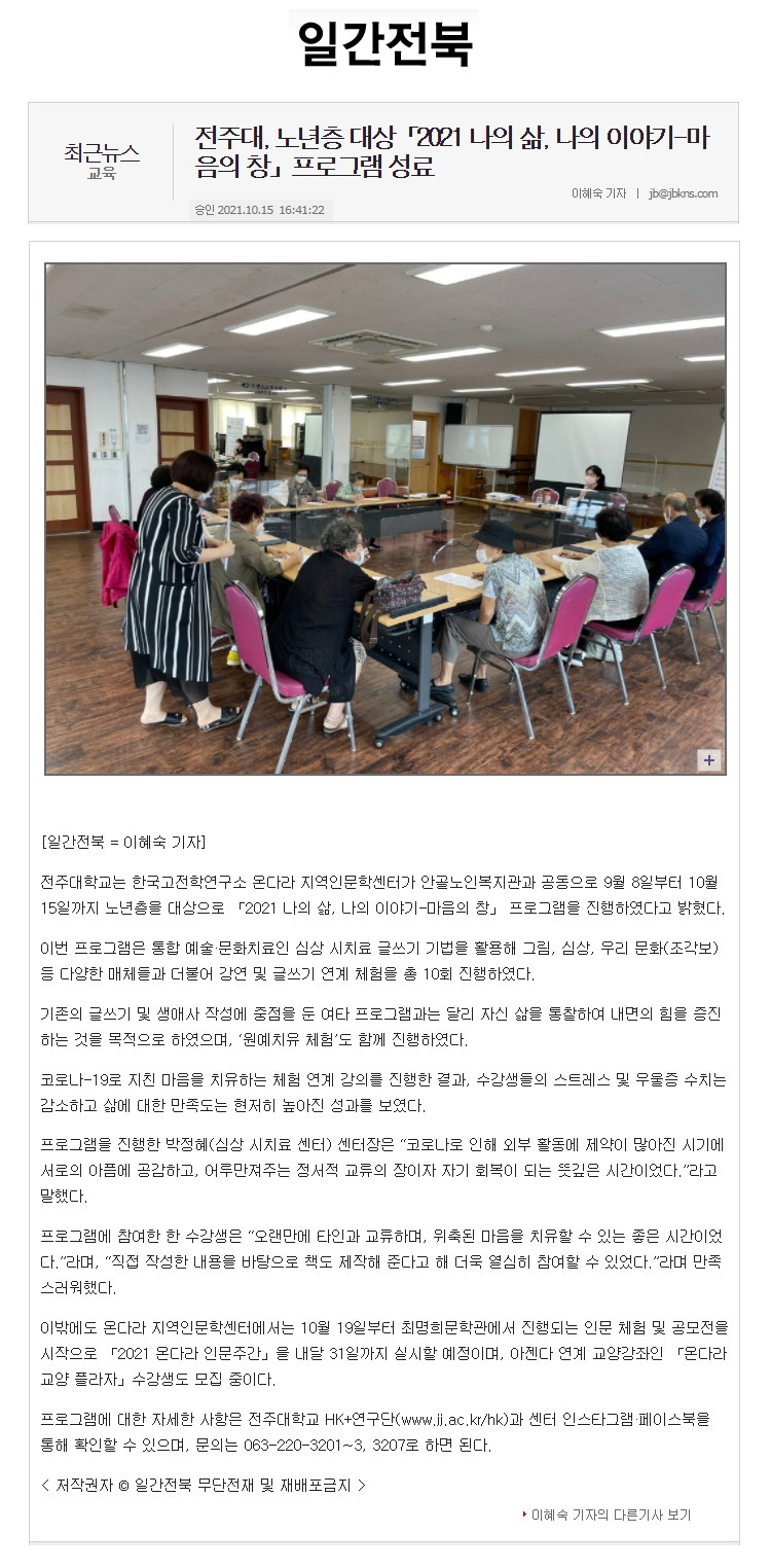 | 454 | 기타 | 전주대, 노년층 대상「2021 나의 삶, 나의 이야기-마음의 창」프로그램 성료 | 온다라 지역인문학센터 | 21-10-20 | 207 |