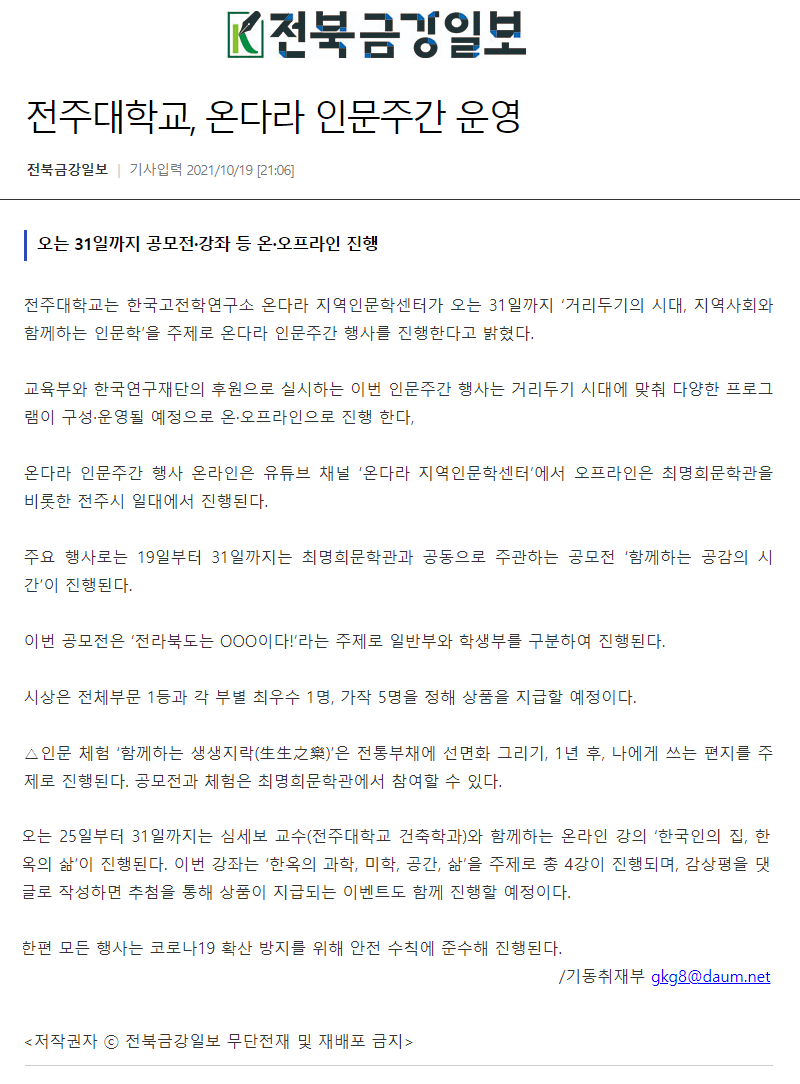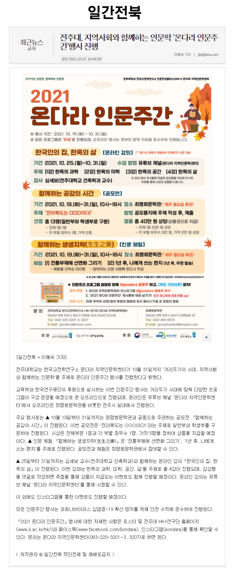 | 457 | 기타 | 전주대, 지역사회와 함께하는 인문학 ‘온다라 인문주간’행사 진행 | 온다라 지역인문학센터 | 21-10-20 | 207 |