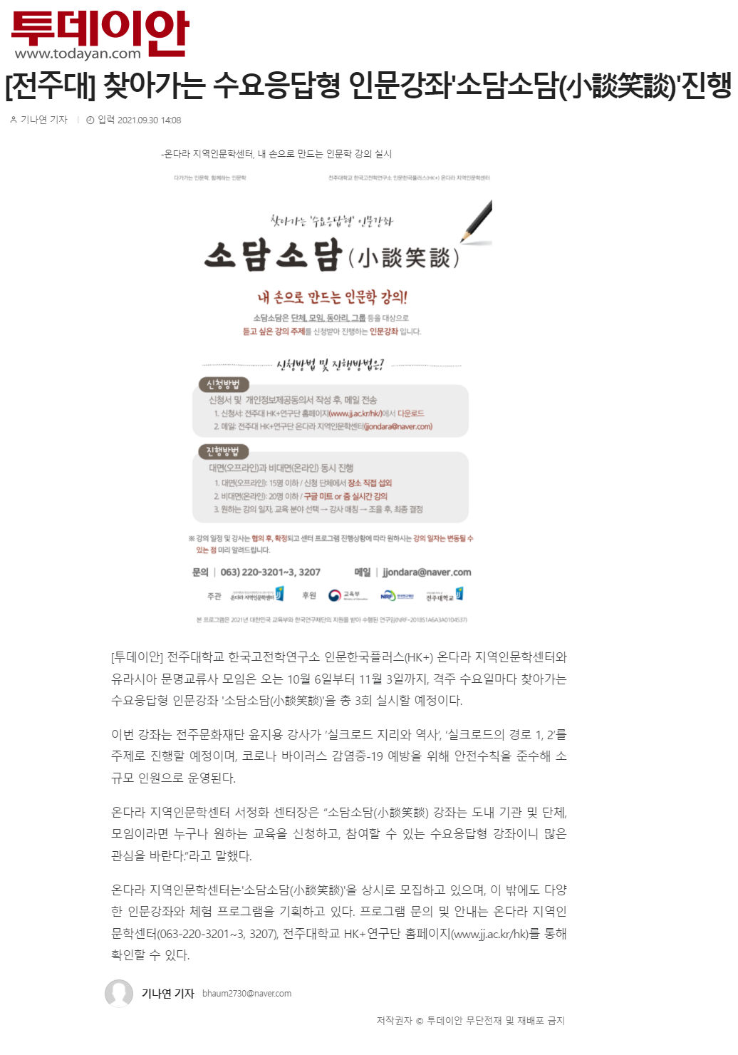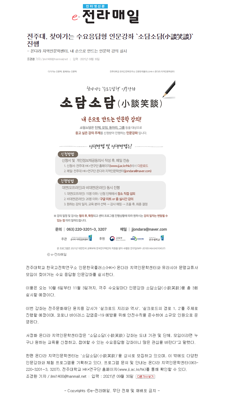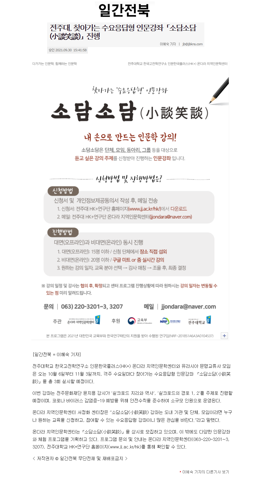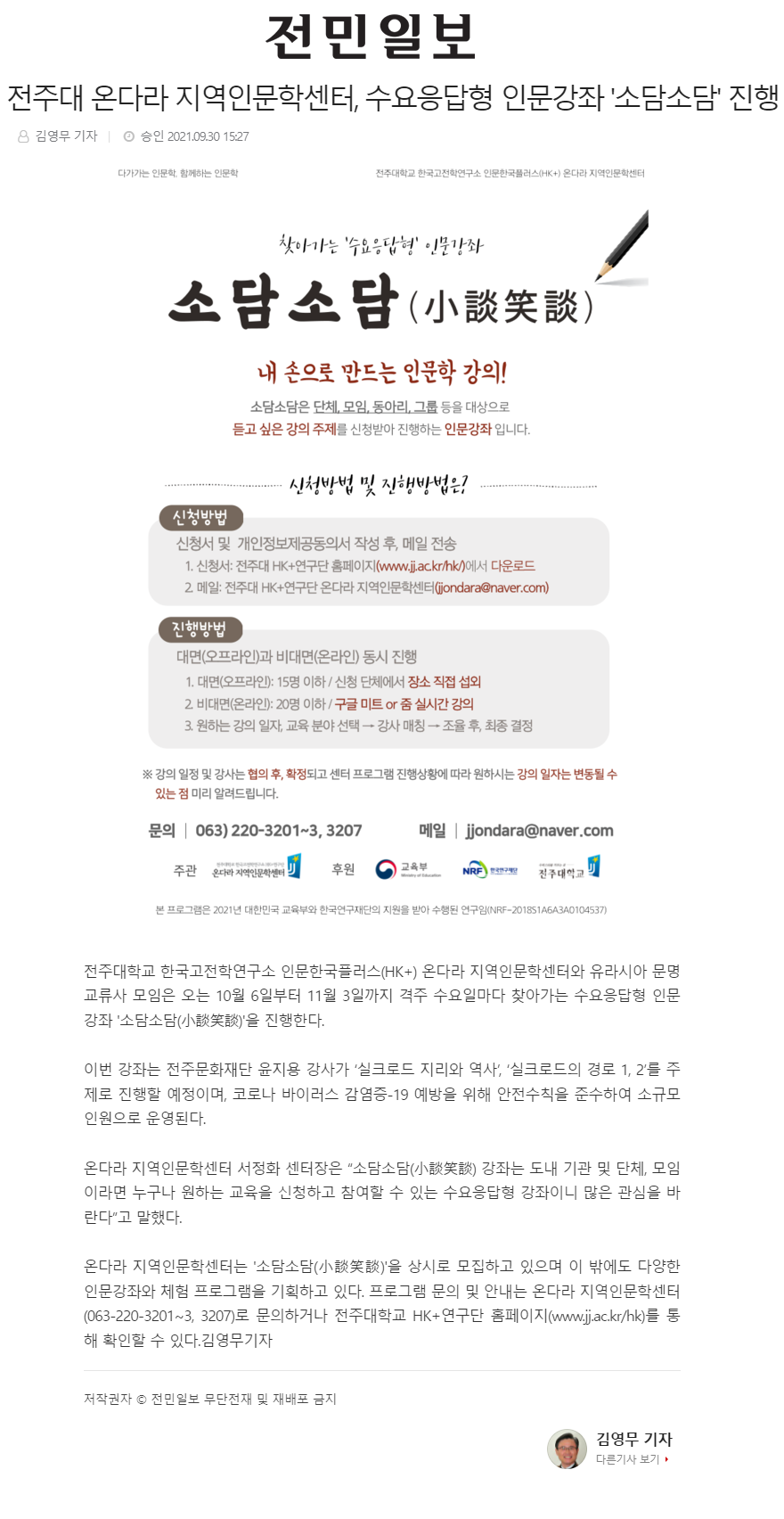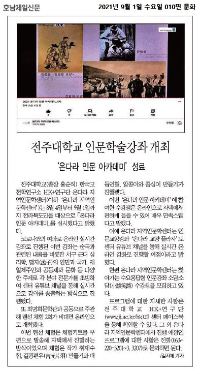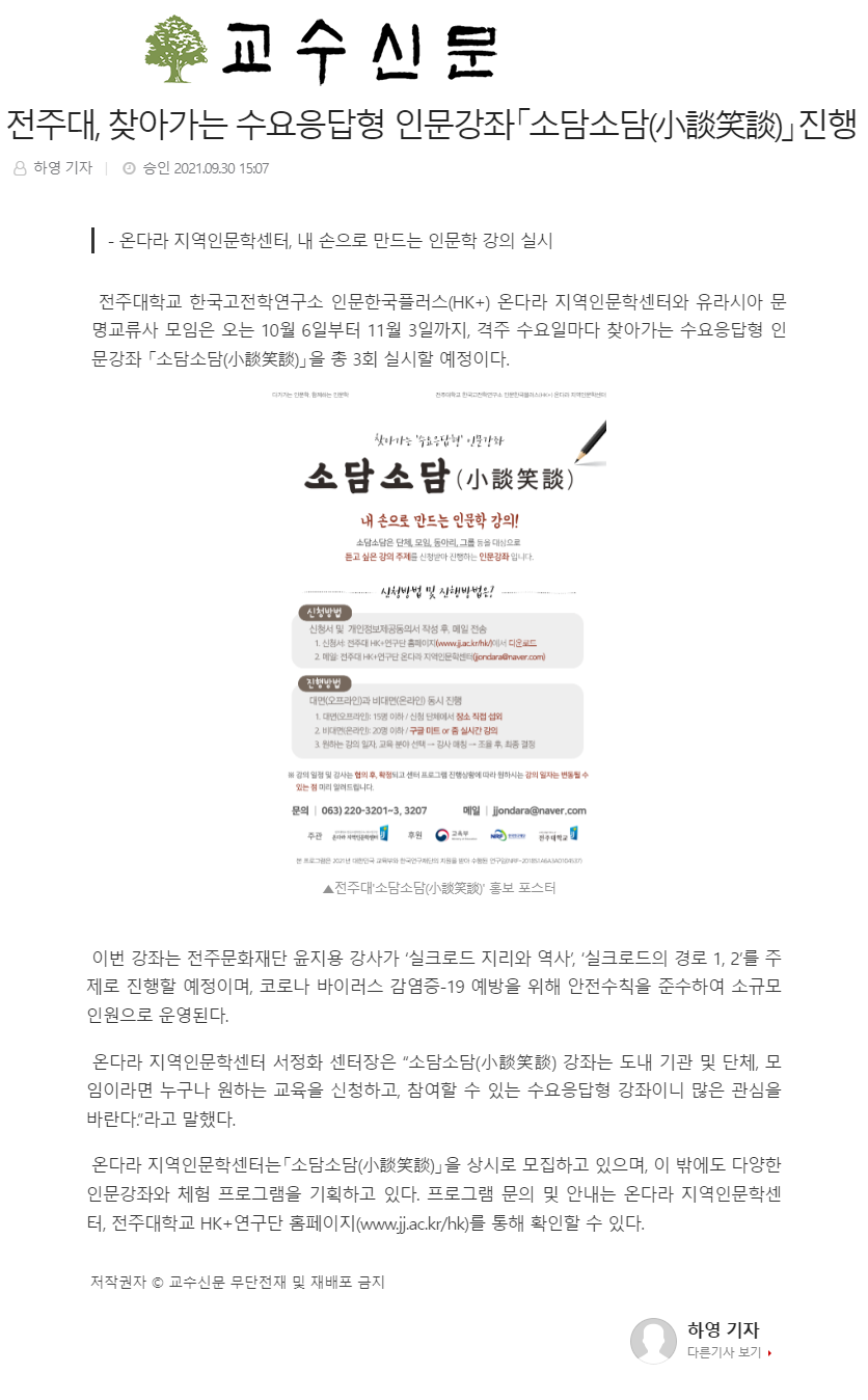 | 434 | 기타 | 전주대 온다라 지역인문학센터, 수요응답형 인문강좌 '소담소담' 진행 | 온다라 지역인문학센터 | 21-10-05 | 219 |