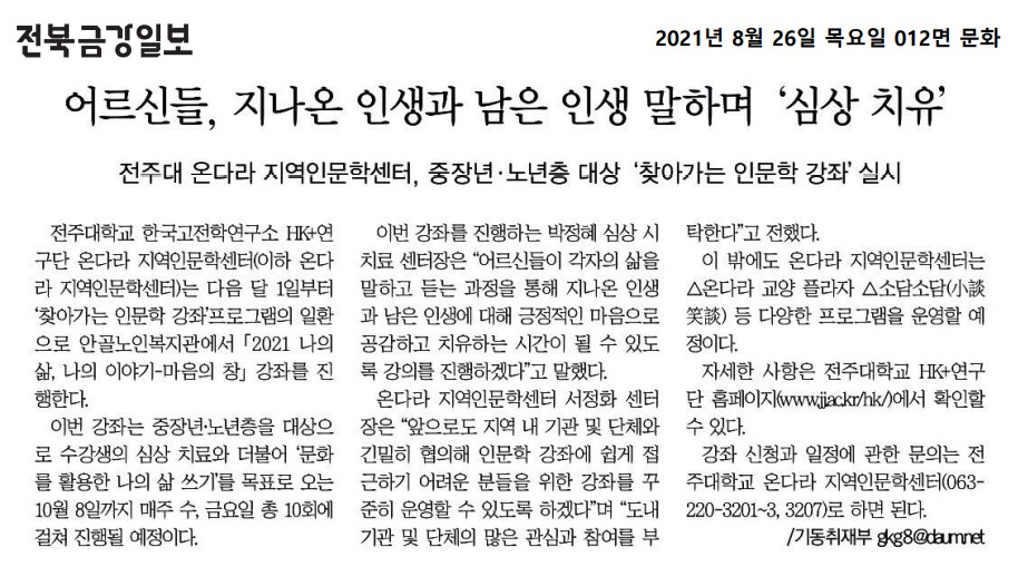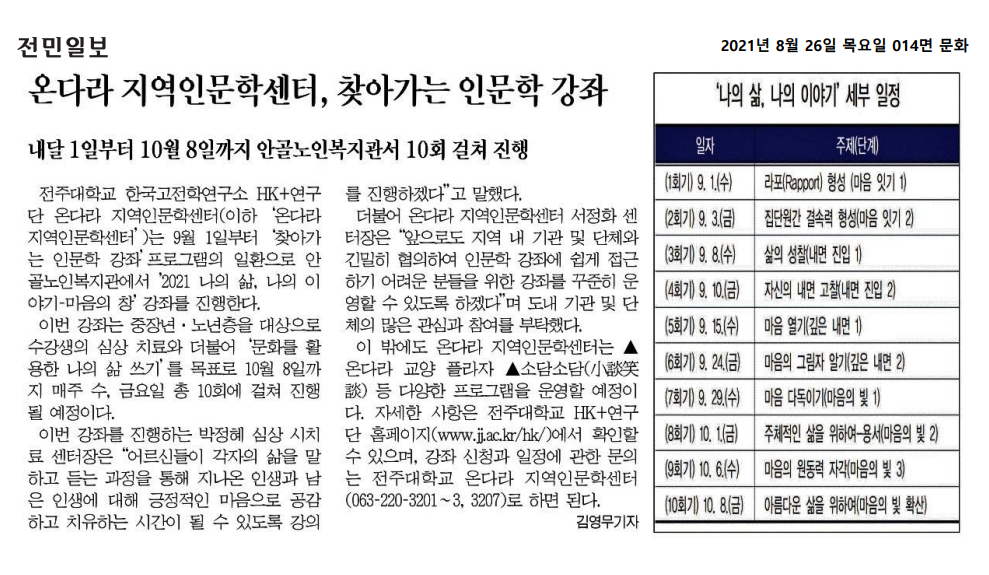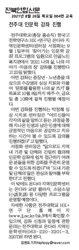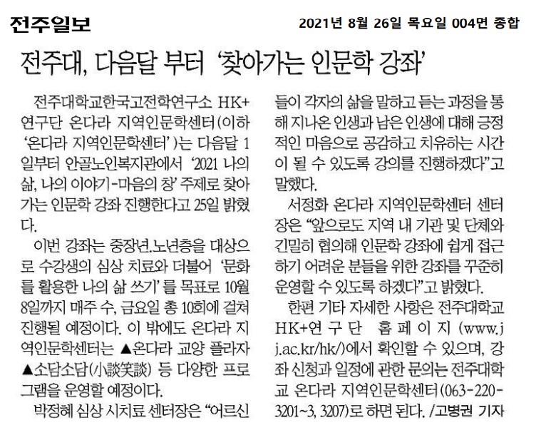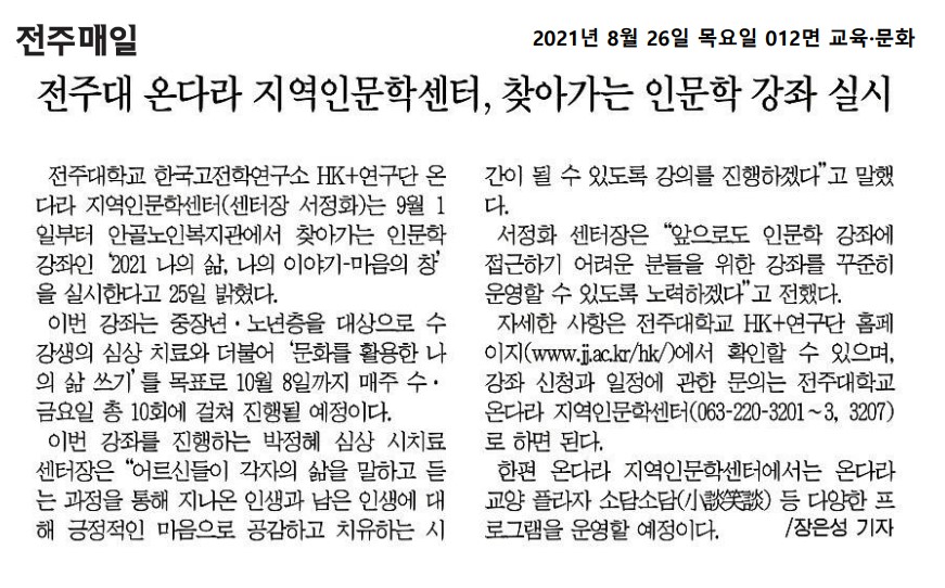 | 421 | 기타 | 전주대 온다라 지역인문학센터, 찾아가는 인문학 강좌 실시 | 온다라 지역인문학센터 | 21-09-15 | 195 |