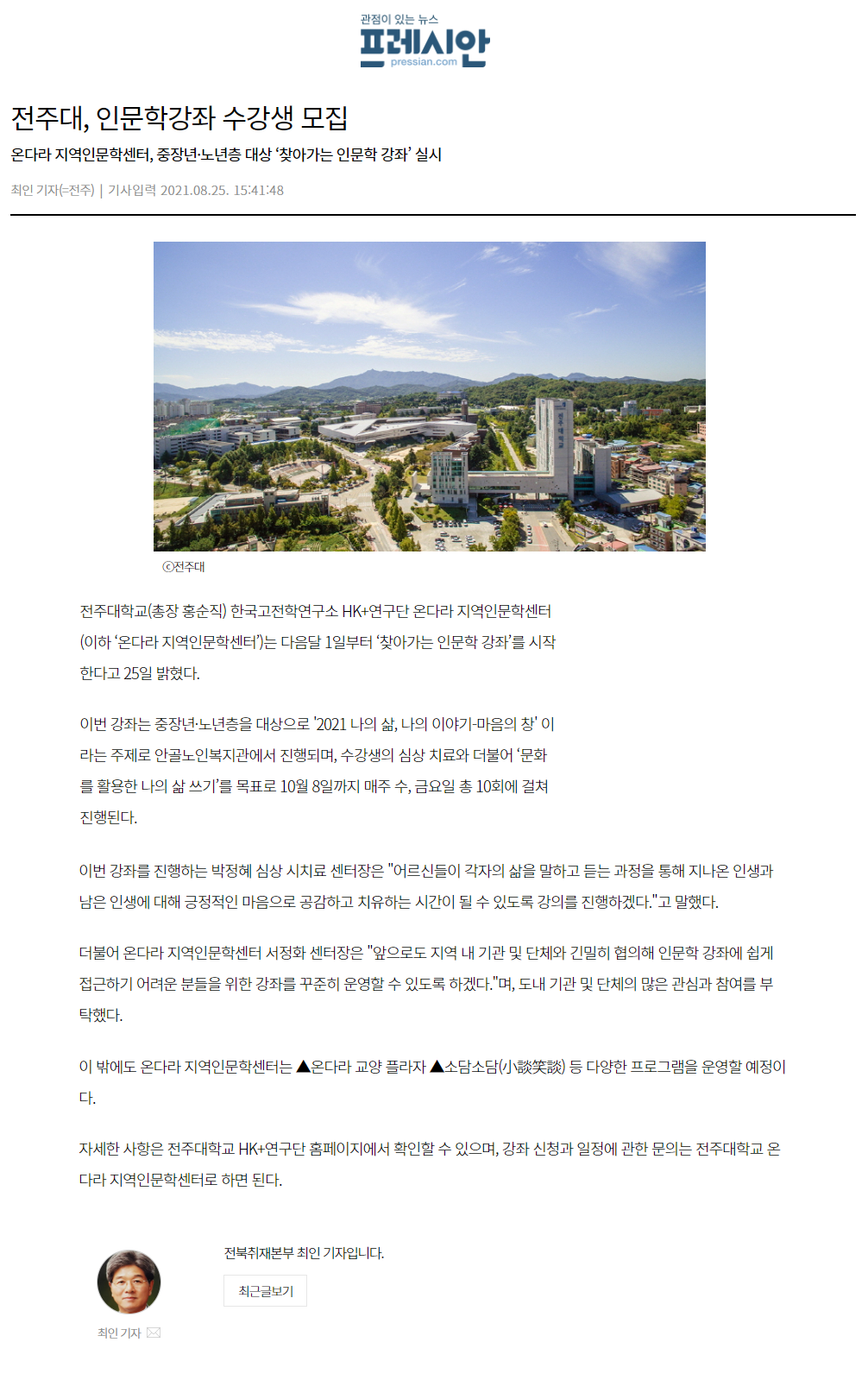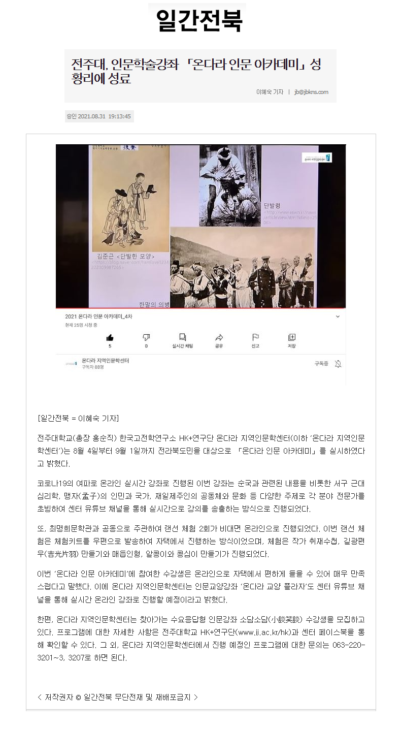 | 413 | 기타 | 전주대, 인문학술강좌 '온다라 인문 아카데미' 성황리 마감 | 온다라 지역인문학센터 | 21-09-08 | 209 |