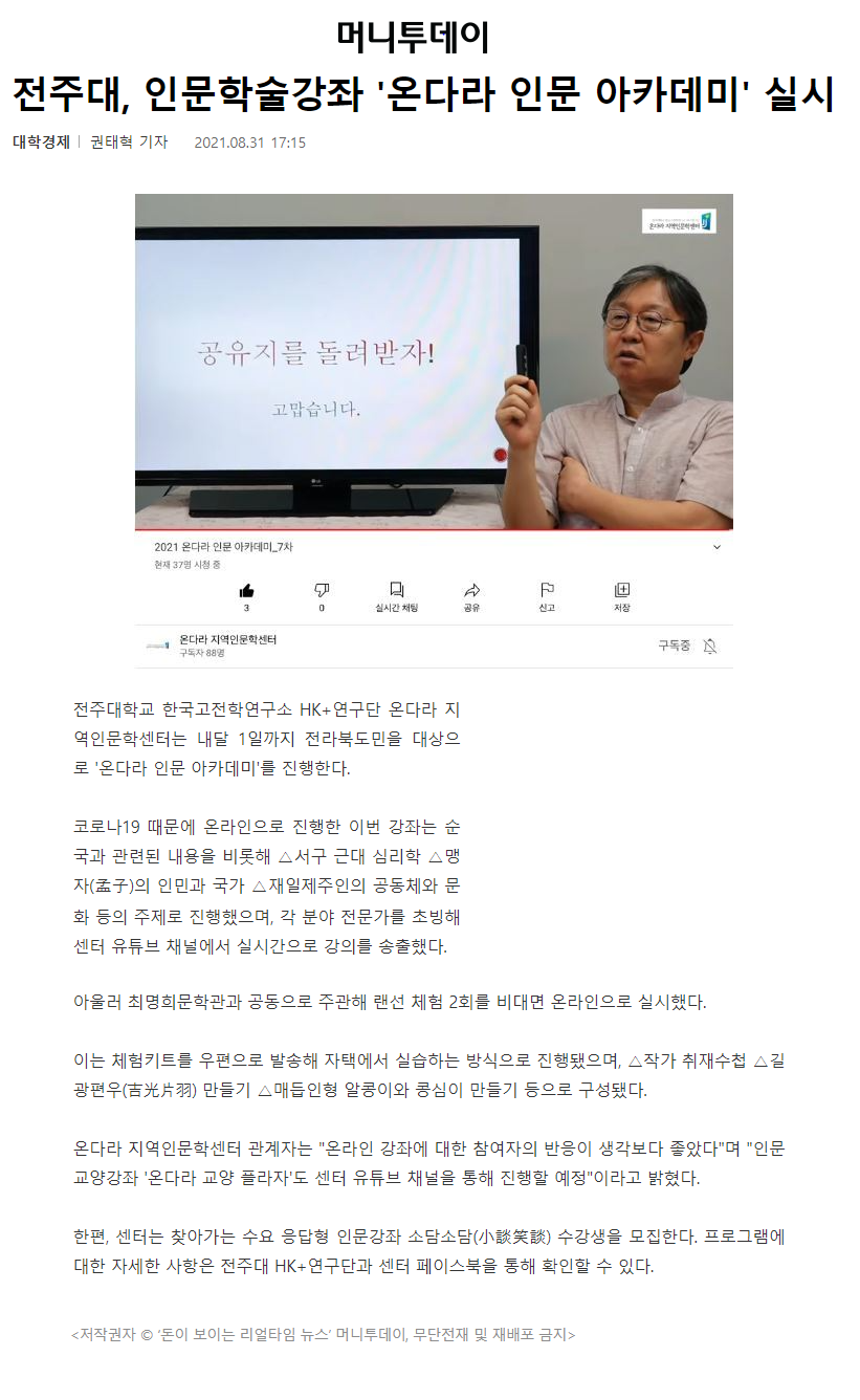 | 411 | 기타 | 전주대, 인문학술강좌 「온다라 인문 아카데미」성황리에 성료 | 온다라 지역인문학센터 | 21-09-08 | 199 |