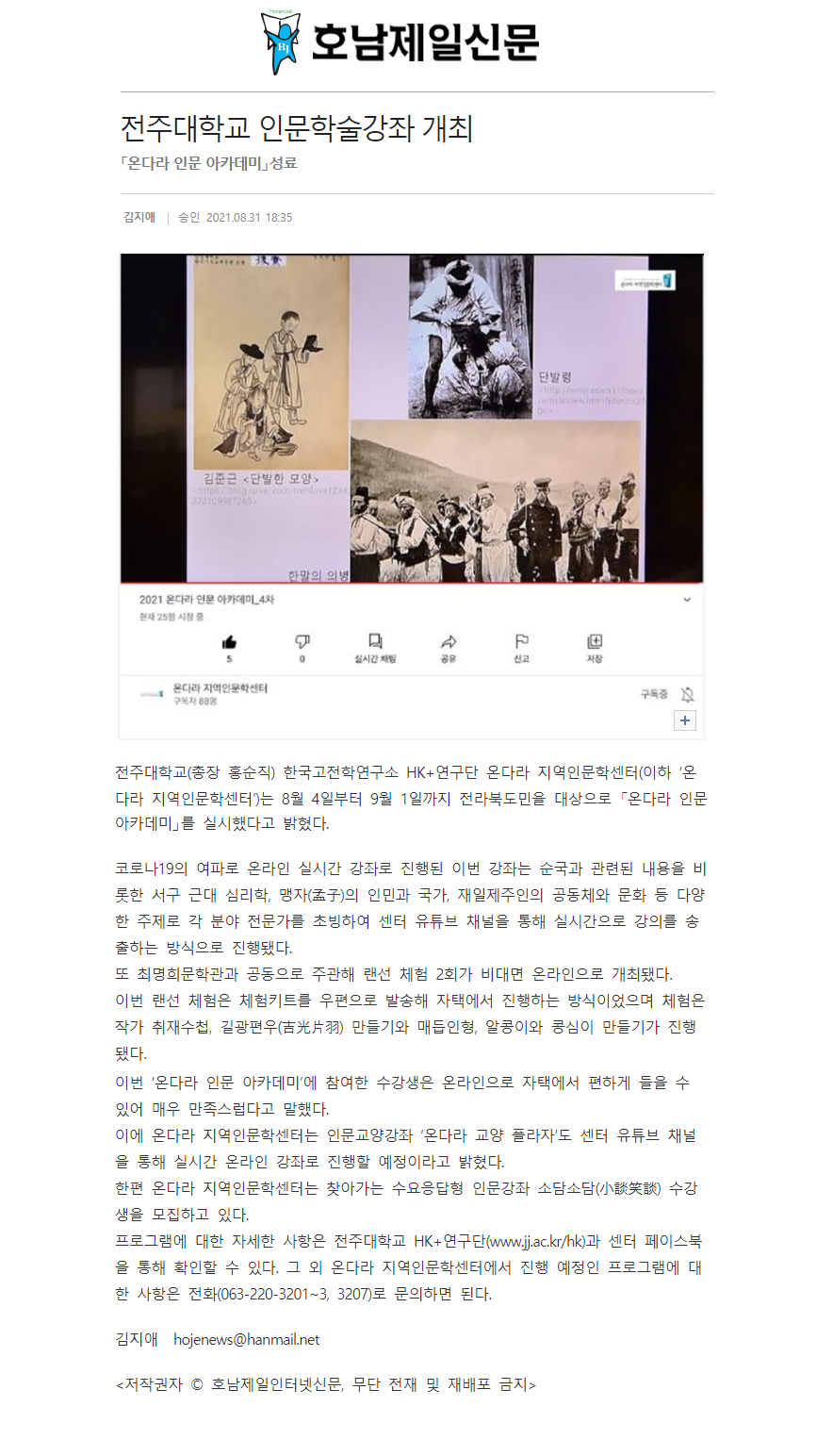 | 412 | 기타 | 전주대, 인문학술강좌 '온다라 인문 아카데미' 성료 | 온다라 지역인문학센터 | 21-09-08 | 208 |