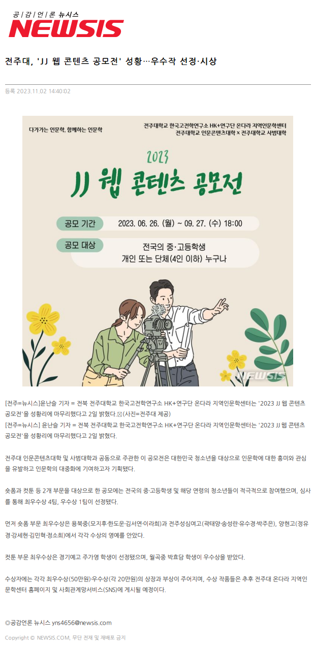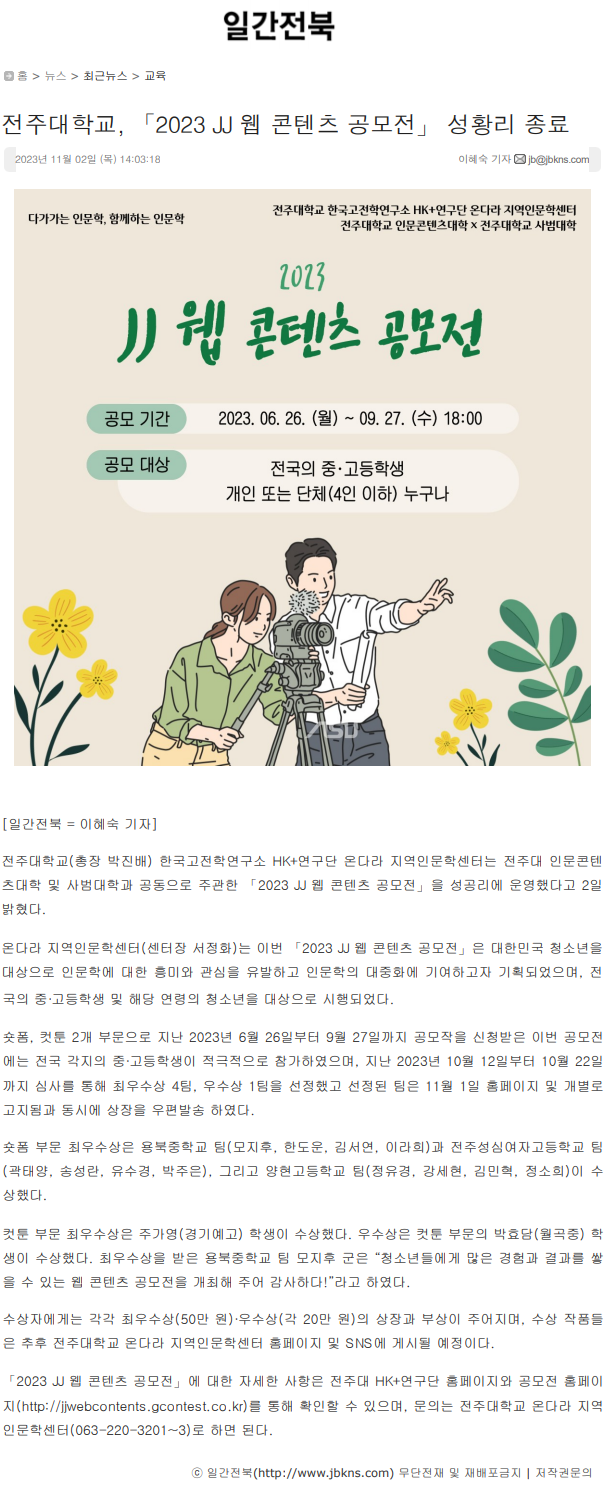 | 710 | 기타 | 전주대, '2023 JJ 웹 콘텐츠 공모전' 성황리 종료 | 온다라 지역인문학센터 | 23-11-14 | 183 |