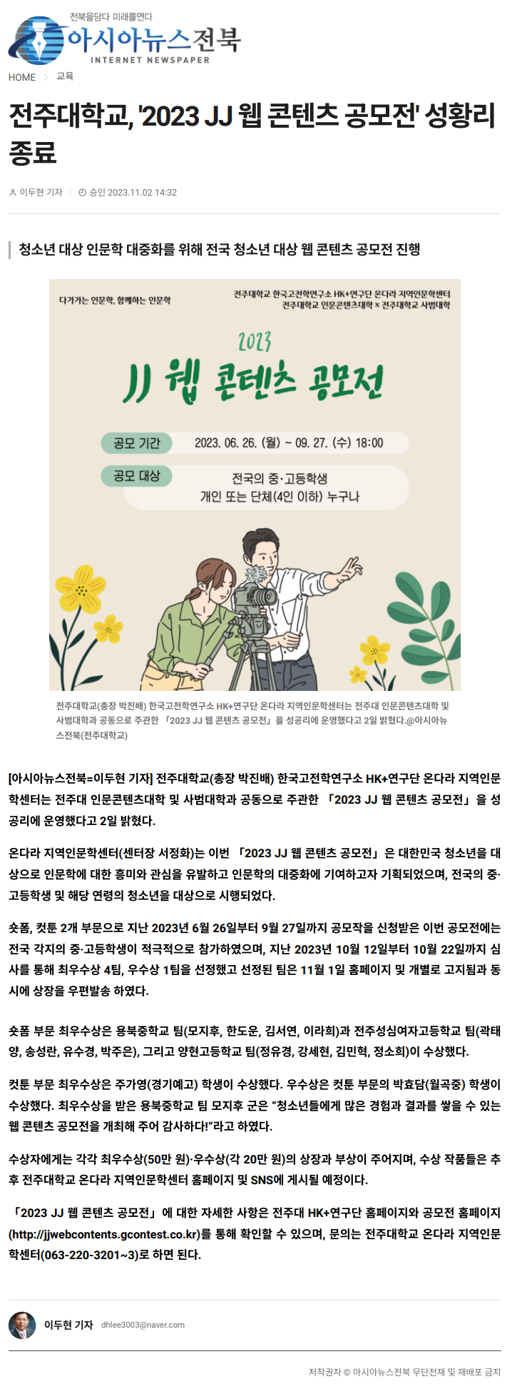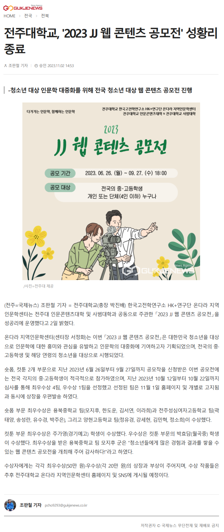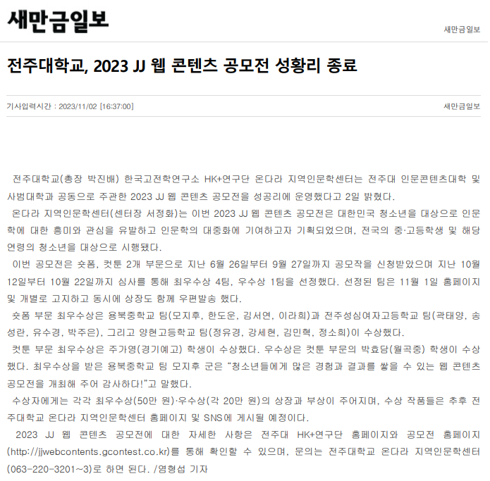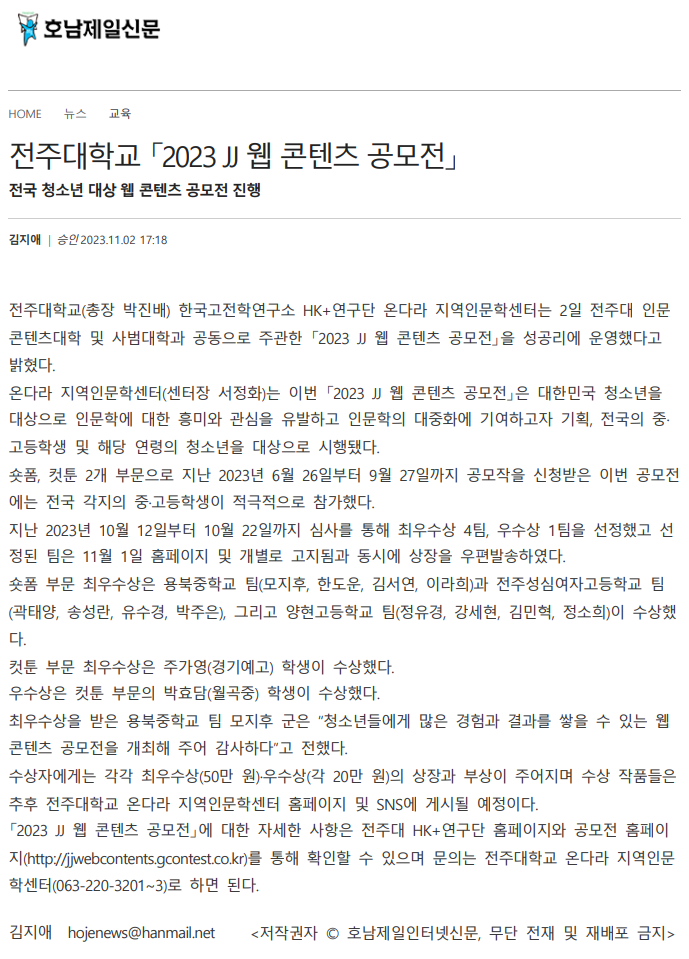 | 709 | 기타 | 전주대, ‘2023 JJ 웹 콘텐츠 공모전’ 성황리 마무리 | 온다라 지역인문학센터 | 23-11-14 | 191 |