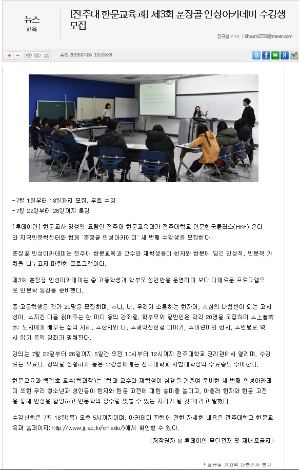 [전주대 한문교육과] 제3회 훈장골 인성아카데미 수강생 모집