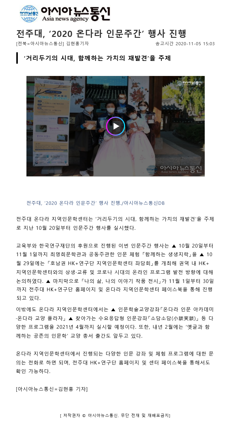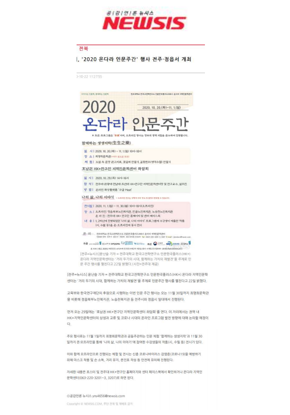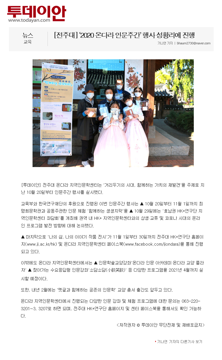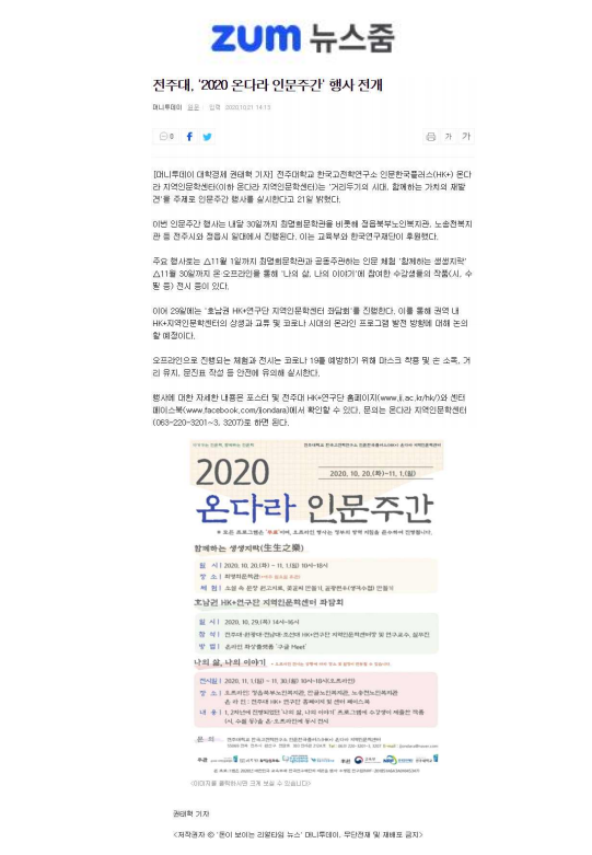 | 301 | 기타 | 전주대 온다라 지역인문학센터, ‘2020 온다라 인문주간’ 행사 진행 | 온다라 지역인문학센터 | 20-10-23 | 220 |