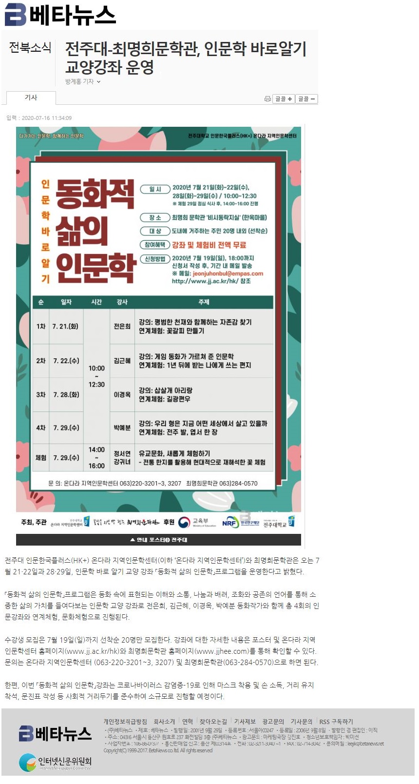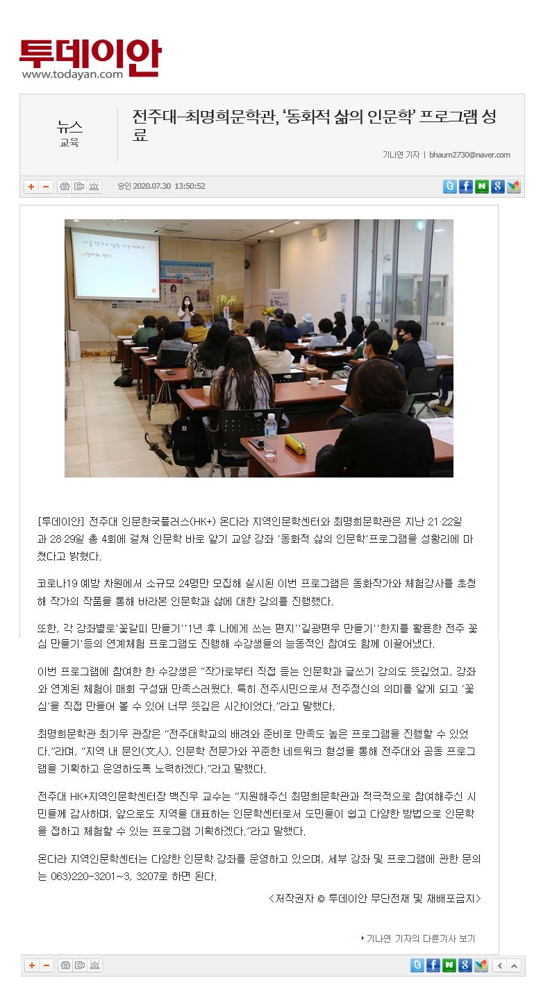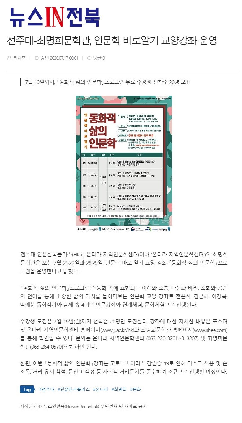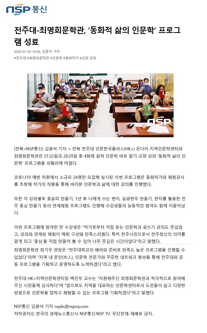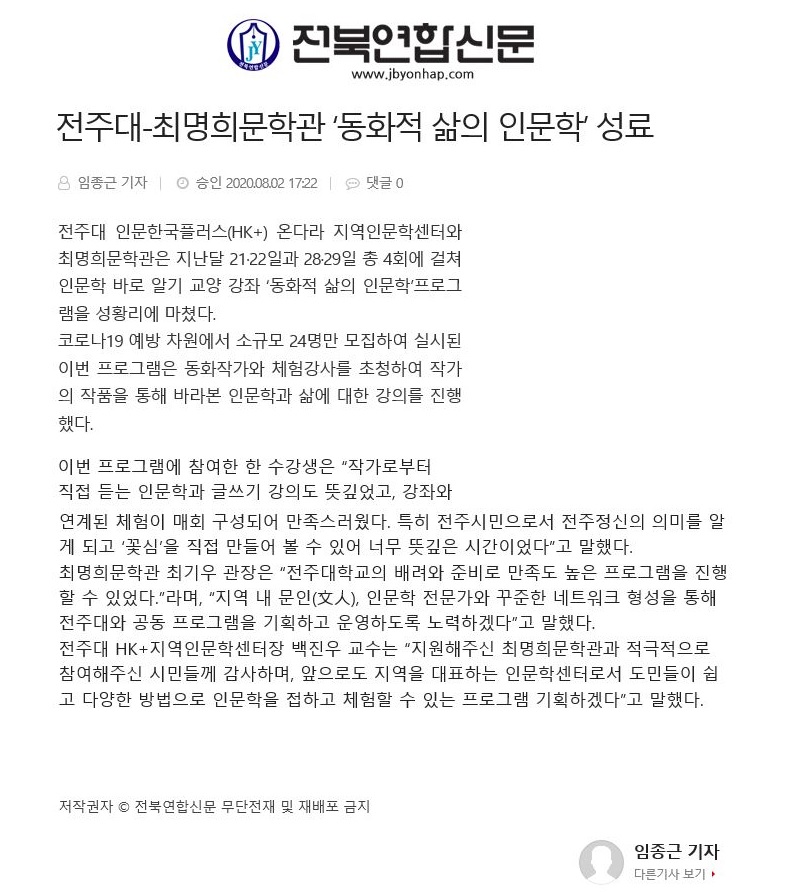 | 288 | 기타 | 전주대-최명희문학관 '동화적 삶의 인문학' 프로그램 성료 | 온다라 지역인문학센터 | 20-08-03 | 217 |