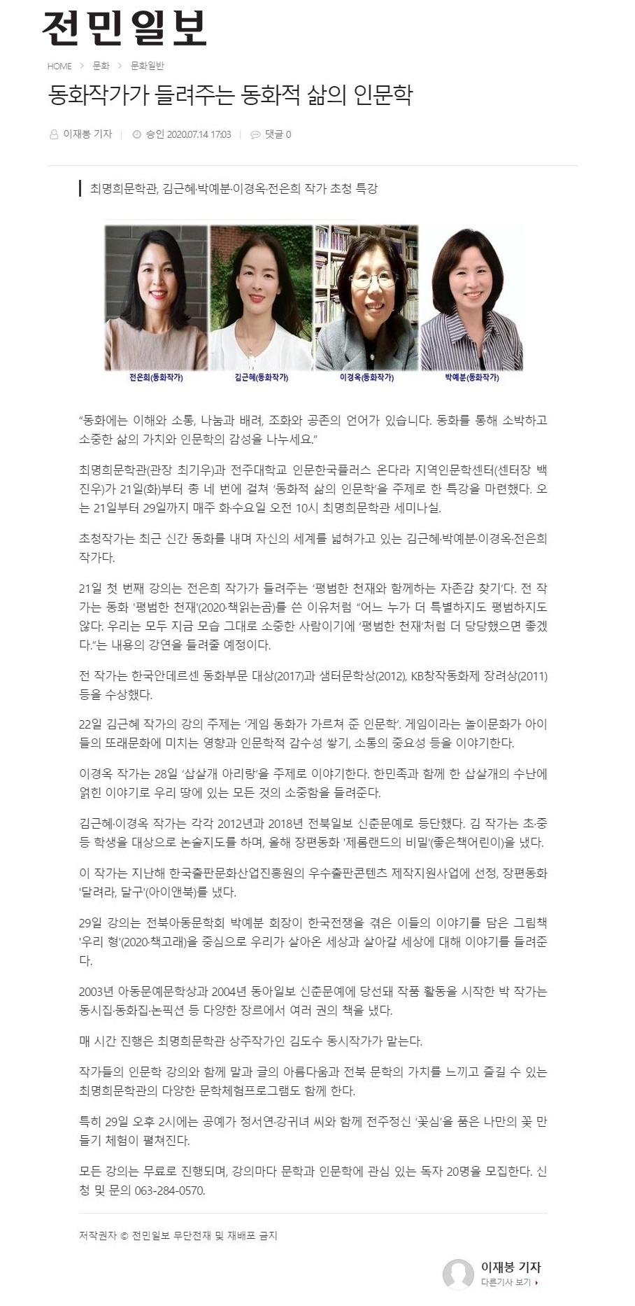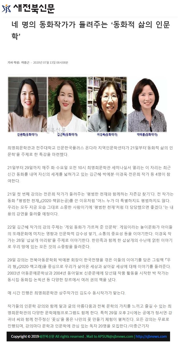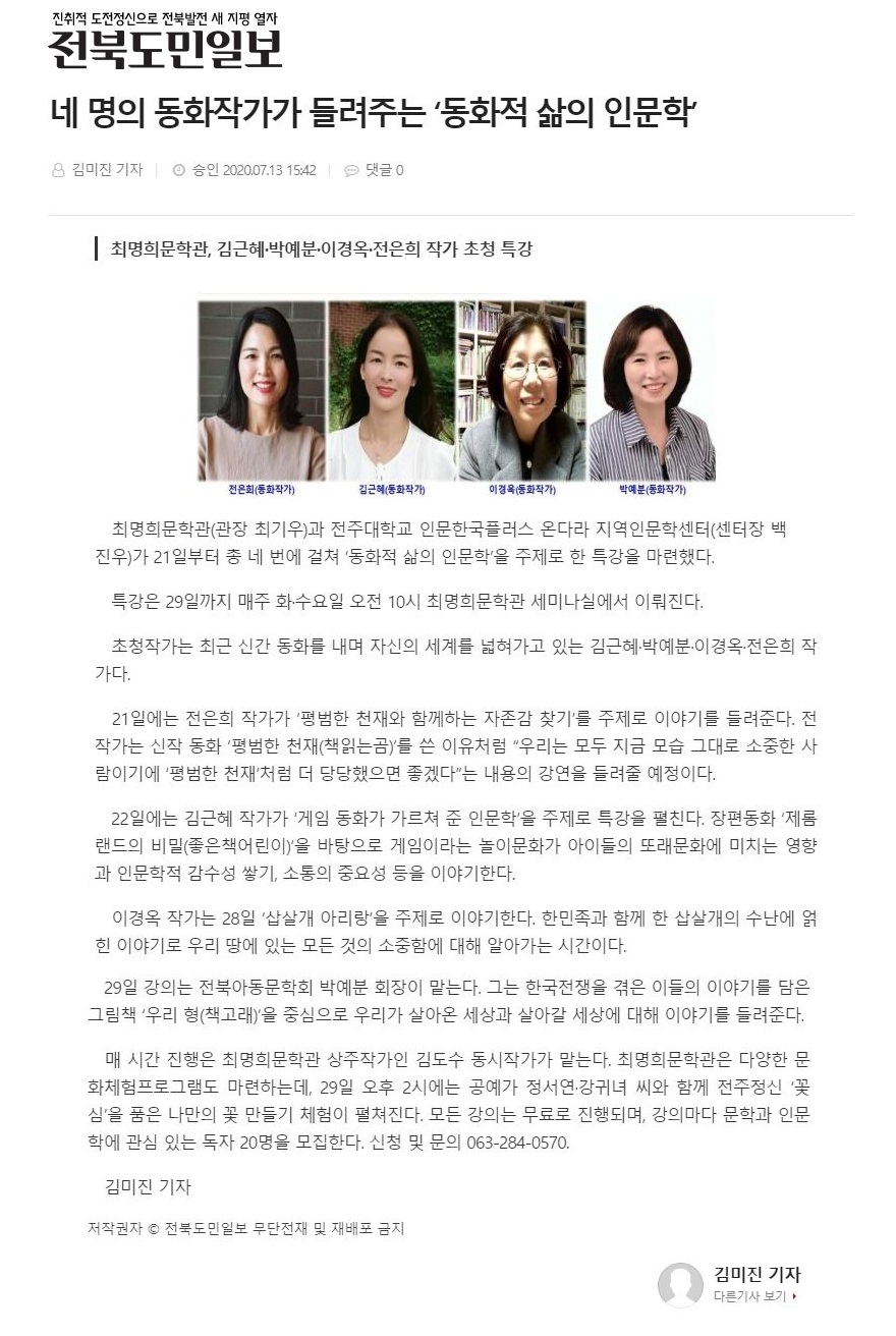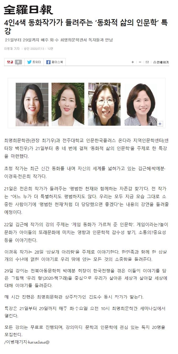 | 269 | 기타 | 4인4색 동화작가가 들려주는 '동화적 삶의 인문학' 특강 | 온다라 지역인문학센터 | 20-07-27 | 217 |