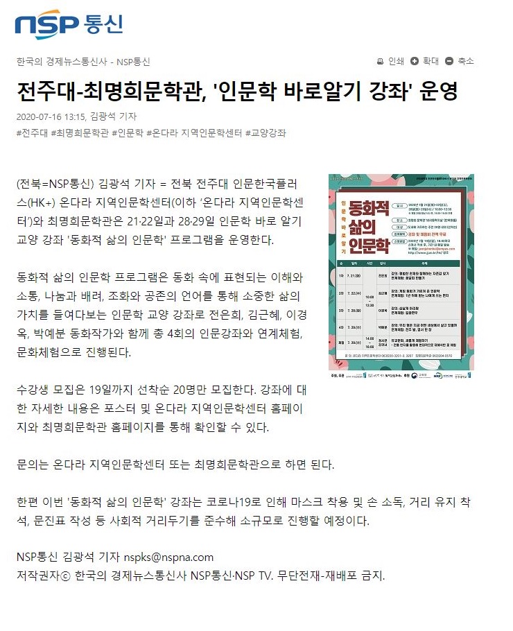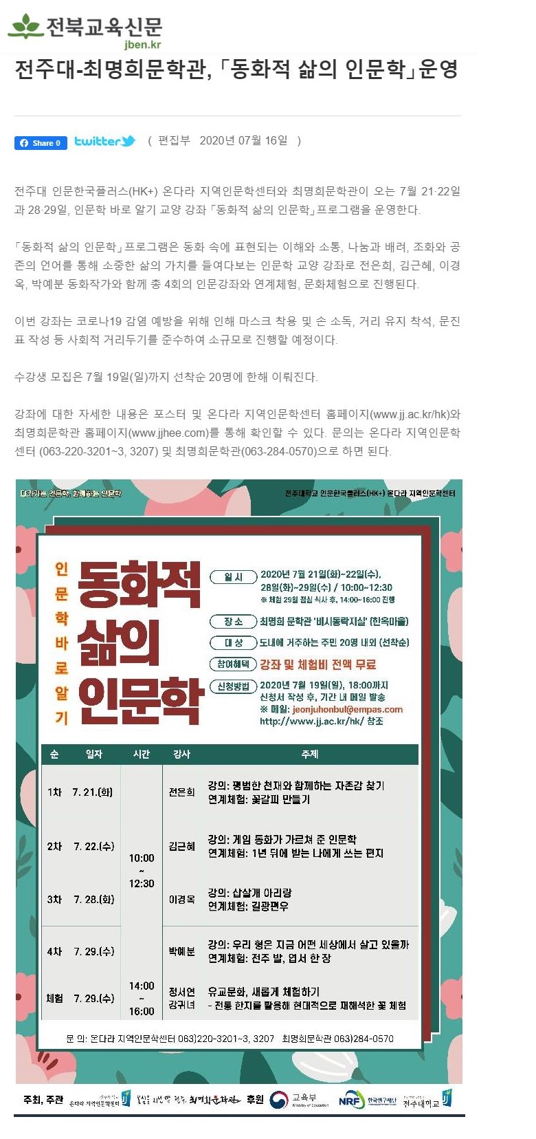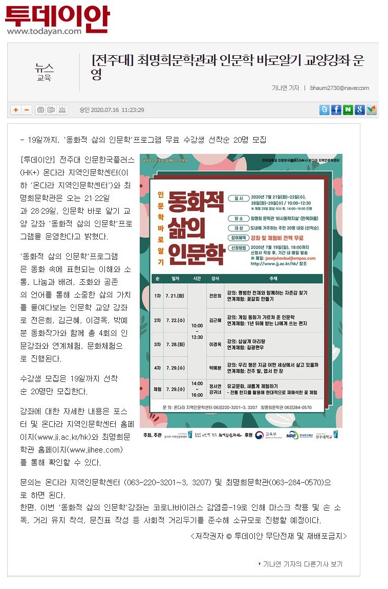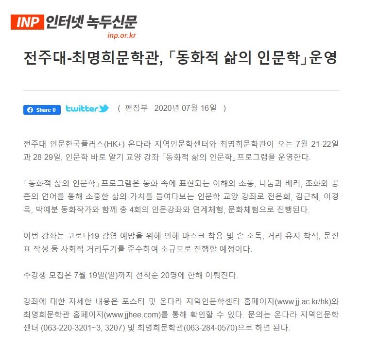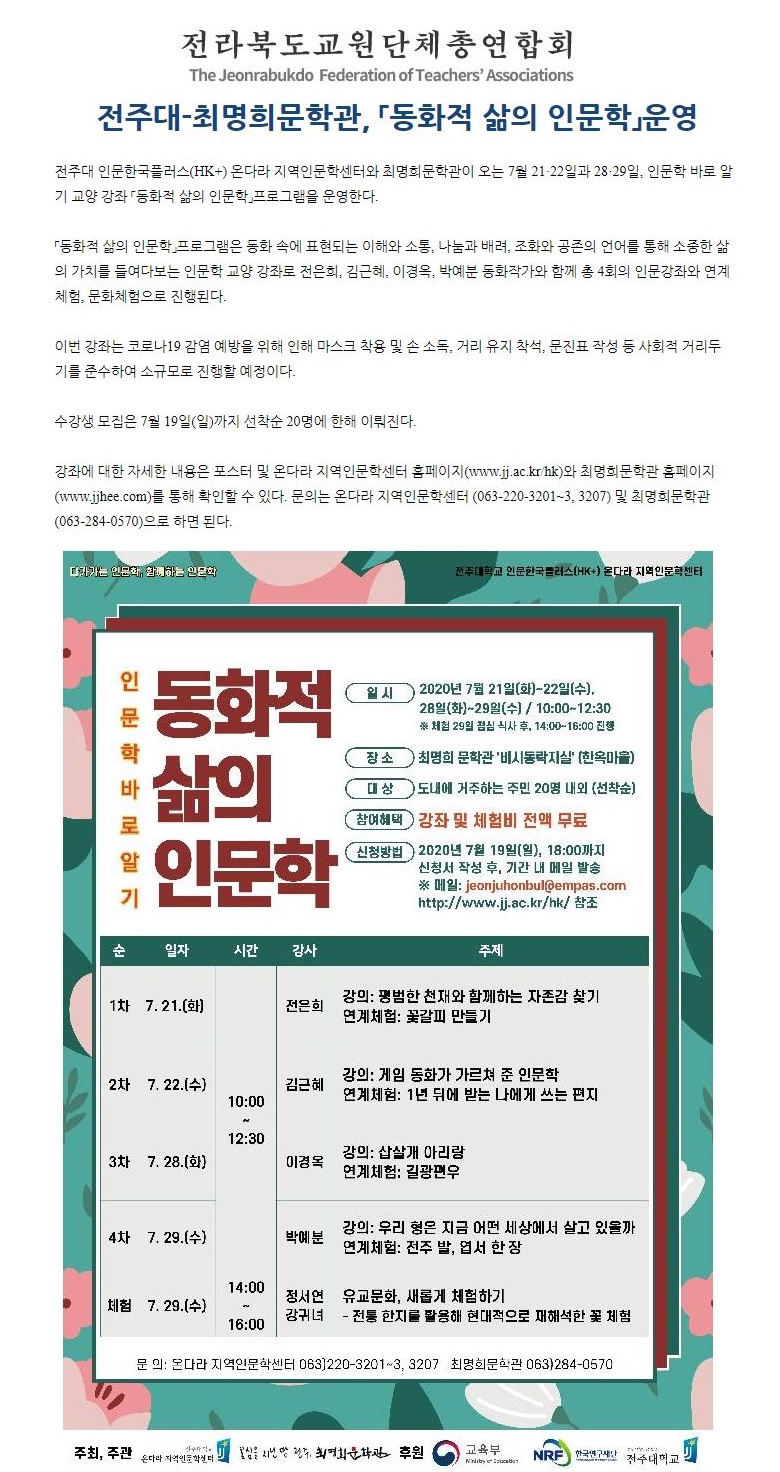 | 276 | 기타 | 전주대-최명희문학관, '동화적 삶의 인문학' 운영 | 온다라 지역인문학센터 | 20-07-27 | 209 |