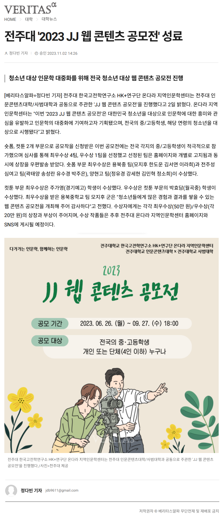 705 기타 전주대 '2023 JJ 웹 콘텐츠 공모전' 성료 온다라 지역인문학센터 23-11-14 177   231102_전주대 '2023 JJ 웹 콘텐츠 공모전' 성료_베리타스알파.png