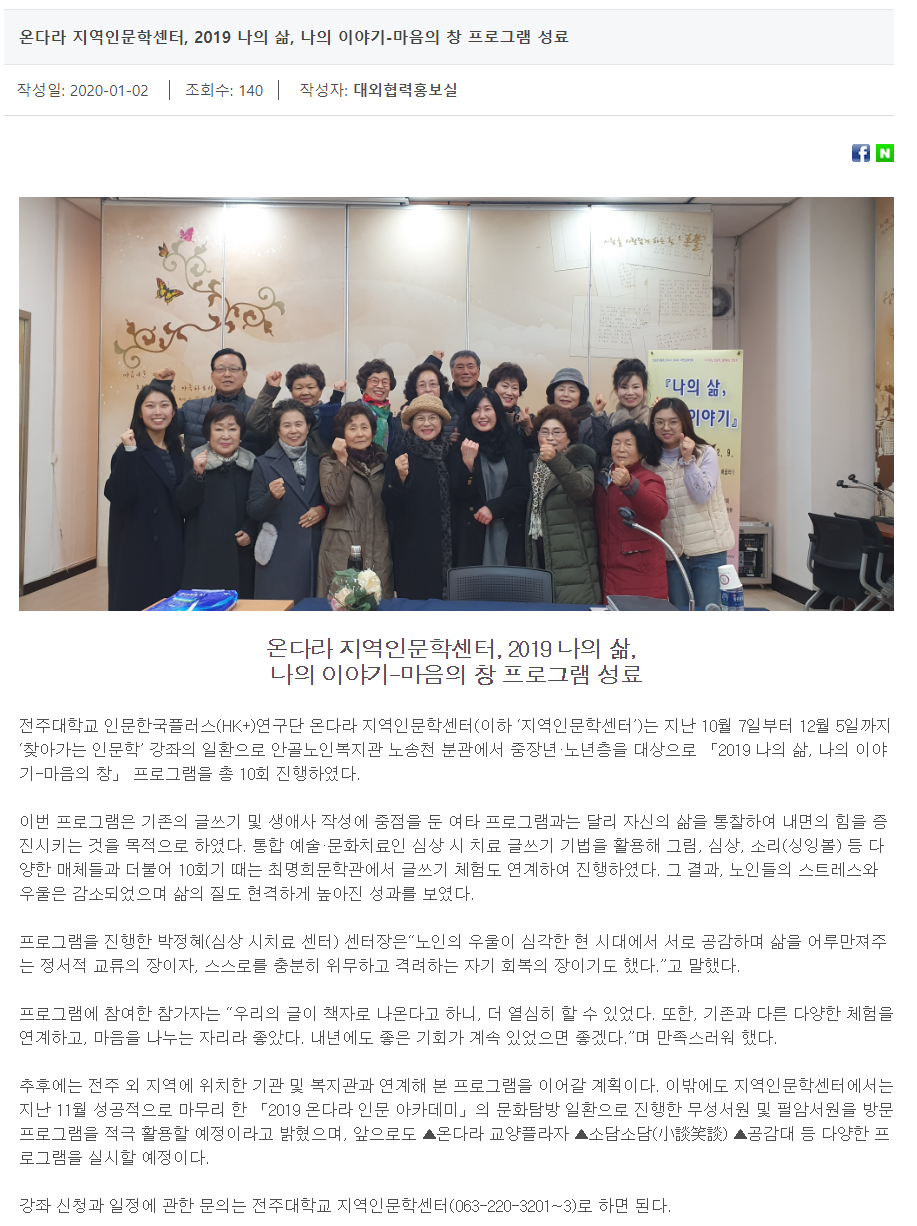 온다라 지역인문학센터, 2019 나의 삶, 나의 이야기-마음의 창 프로그램 성료