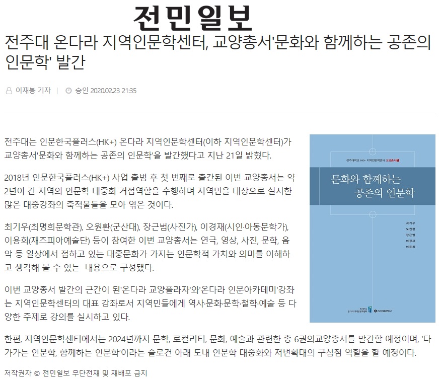 | 225 | 기타 | 전주대 온다라 지역인문학센터, 교양총서'문화와 함께하는 공존의 인문학' 발간 | 온다라 지역인문학센터 | 20-02-27 | 238 |