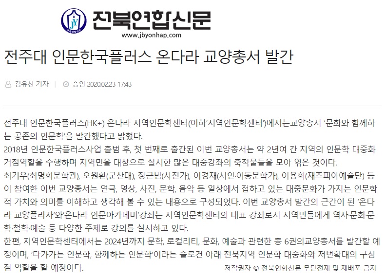 전주대 인문한국플러스 온다라 지역인문학센터, 교양총서 발간