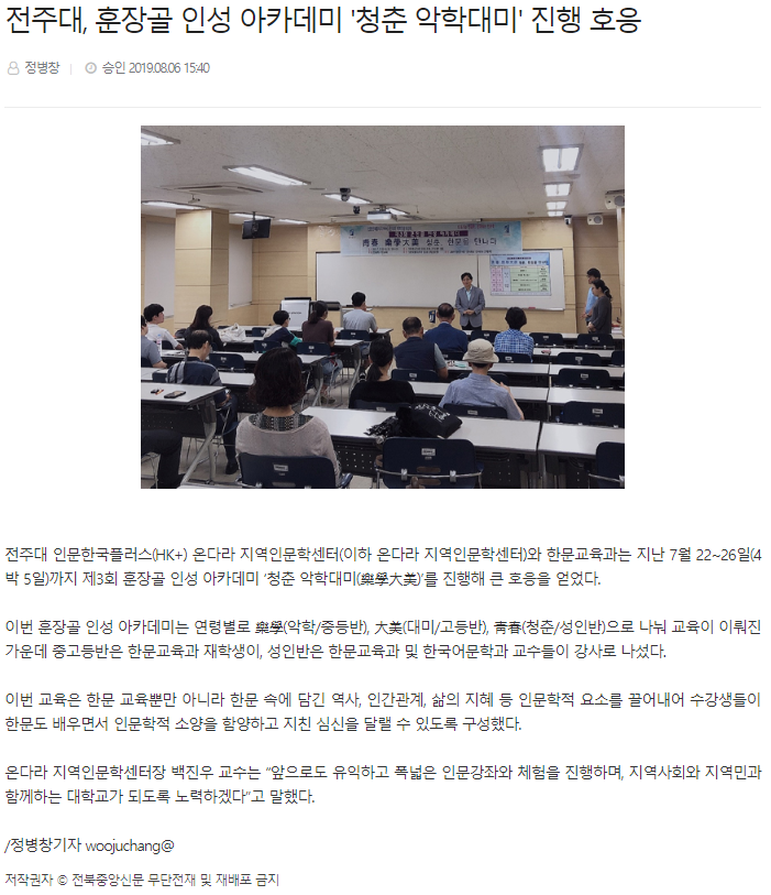 | 179 | 기타 | 전주대, 훈장골 인성 아카데미 '청춘 악학대미' 진행 호응 | 온다라 지역인문학센터 | 19-08-20 | 244 |