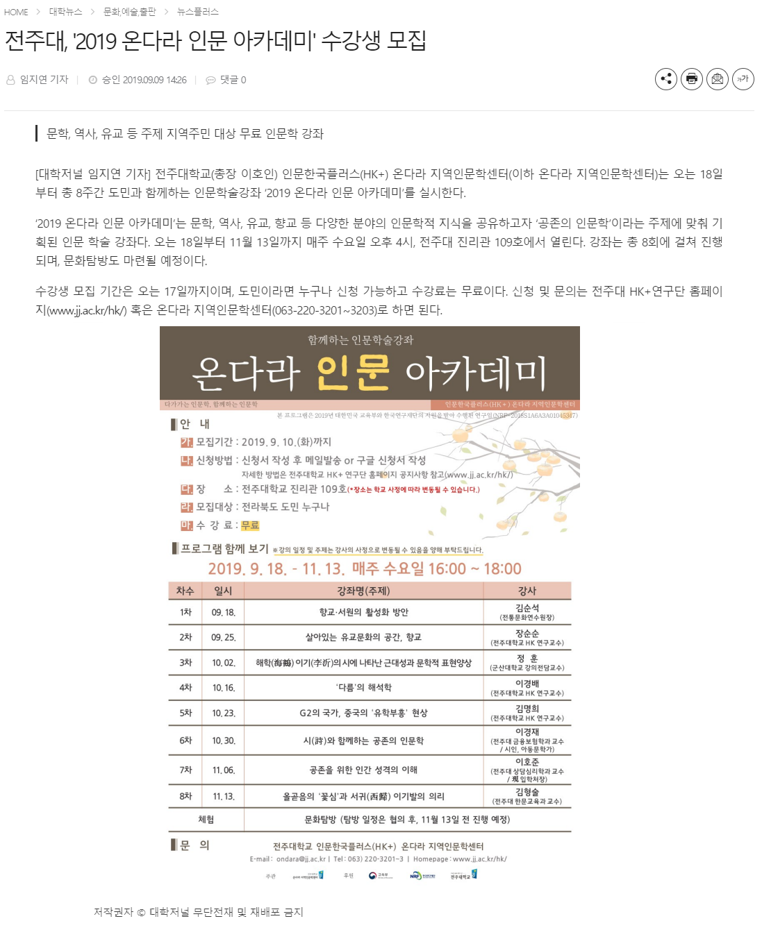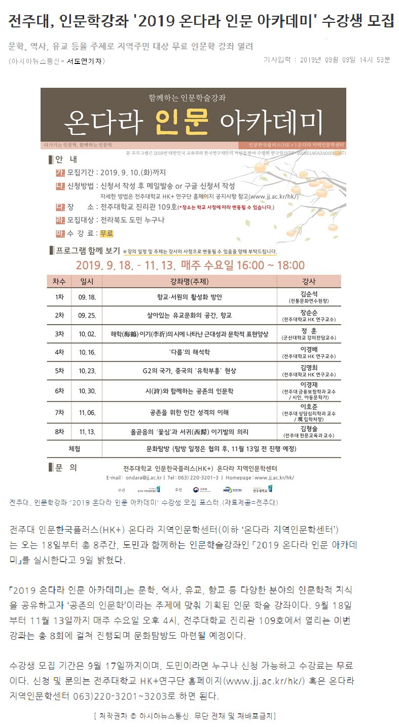 전주대, '2019온다라 인문 아카데미' 수강생 모집