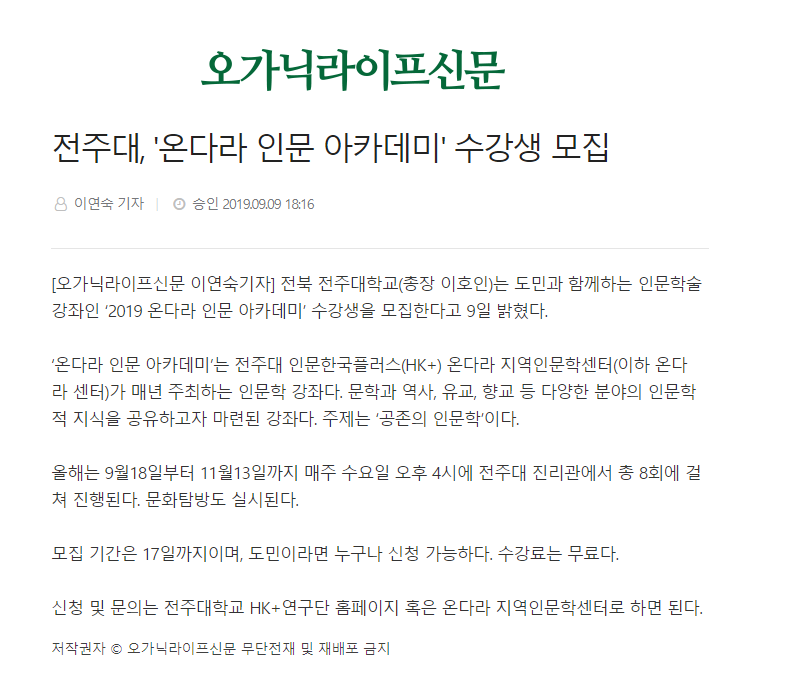 | 187 | 기타 | 인문학강좌 '2019 온다라 인문 아카데미' 수강생 모집 | 온다라 지역인문학센터 | 19-09-11 | 263 |