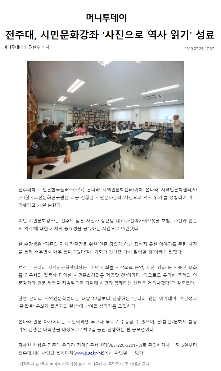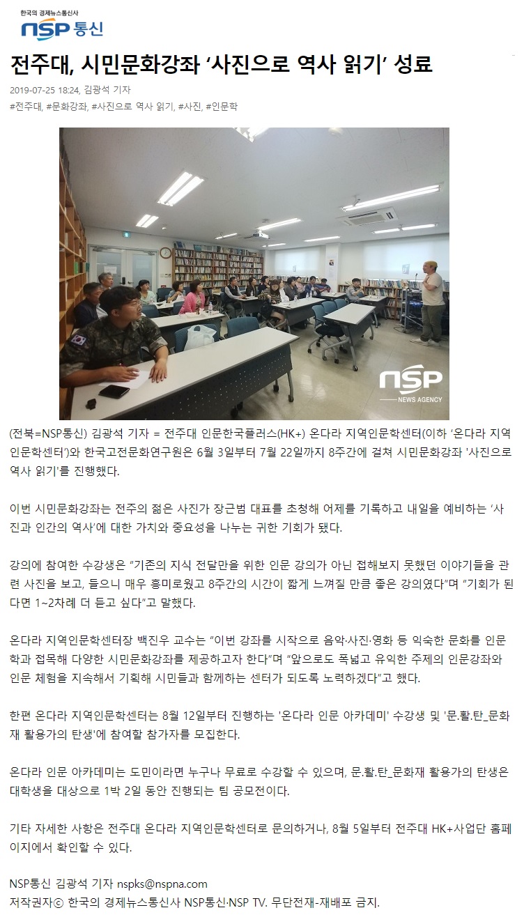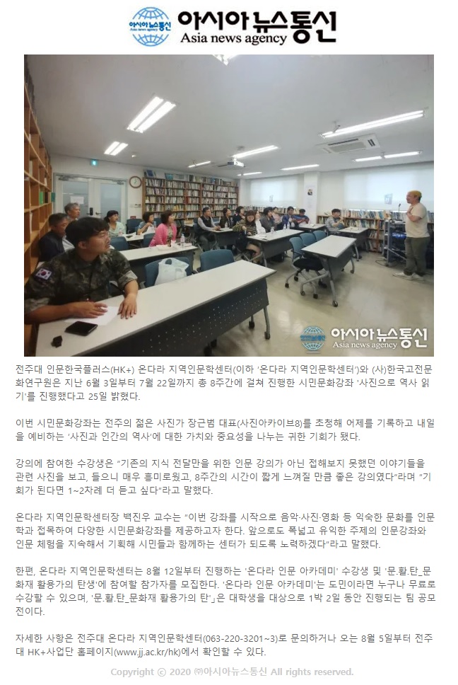 | 170 | 기타 | 전주대, 시민문화강좌 ‘사진으로 역사 읽기’ 성료 | 온다라 지역인문학센터 | 19-08-11 | 243 |