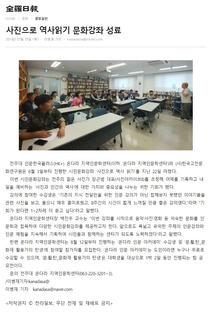| 171 | 기타 | 사진으로 역사읽기 문화강좌 성료 | 온다라 지역인문학센터 | 19-08-11 | 230 |