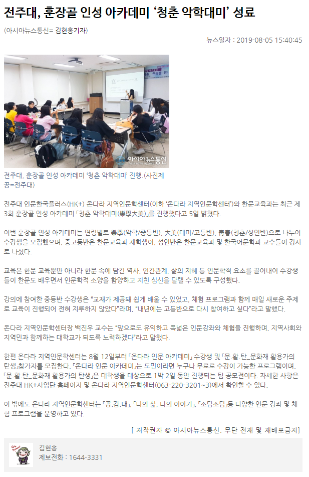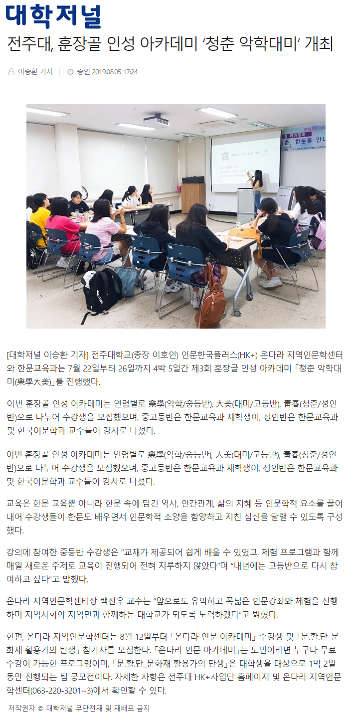 | 177 | 기타 | 전주대, 훈장골 인성 아카데미 '청춘 악학대미' 성료 | 온다라 지역인문학센터 | 19-08-20 | 249 |