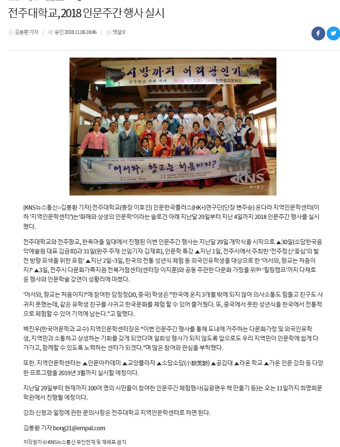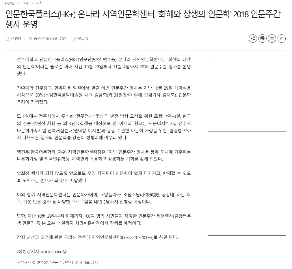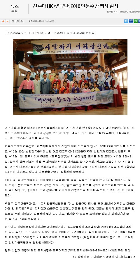| 94 | 기타 | 전주대 HK+연구단, 2018 인문주간 행사 실시 | 온다라 지역인문학센터 | 19-08-10 | 229 |