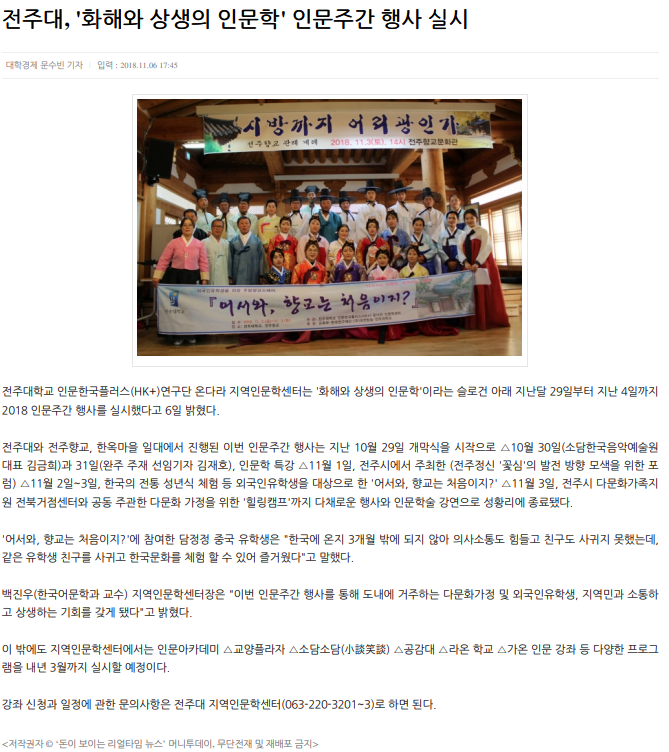 전주대 HK+연구단, 2018 인문주간 행사 실시