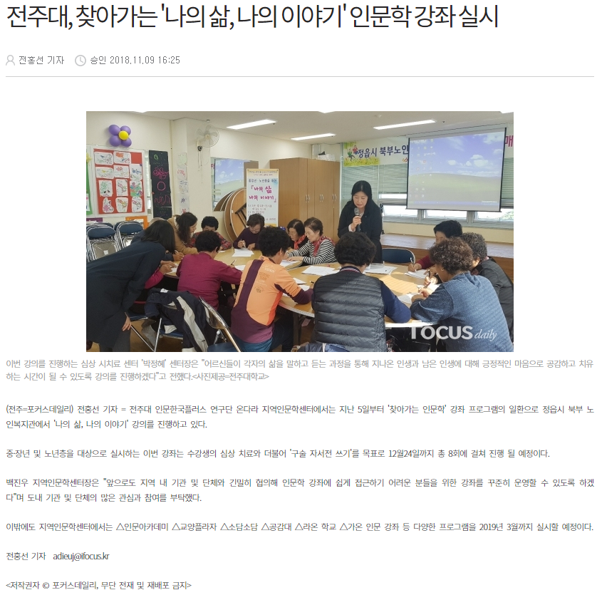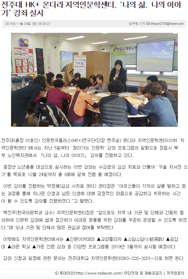 전주대 HK+ 온다라 지역인문학센터, ‘나의 삶, 나의 이야기’ 강좌 실시