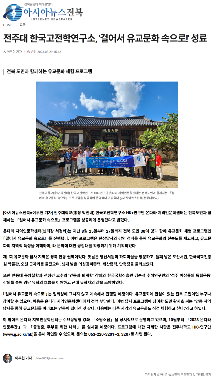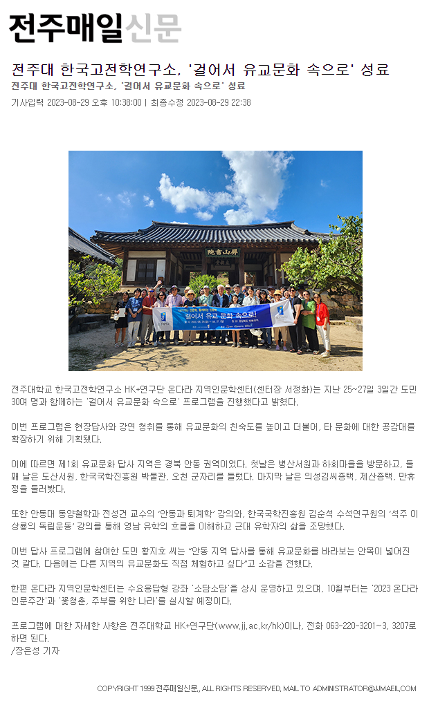 | 687 | 기타 | 전주대 한국고전학연구소, '걸어서 유교문화 속으로!' 성료 | 온다라 지역인문학센터 | 23-10-04 | 243 |