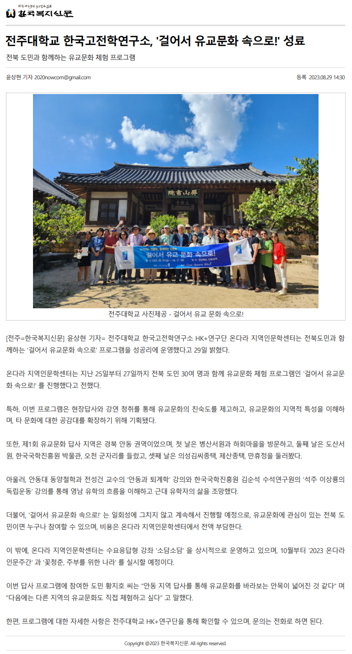 전주대학교 한국고전학연구소, '걸어서 유교문화 속으로!' 성료