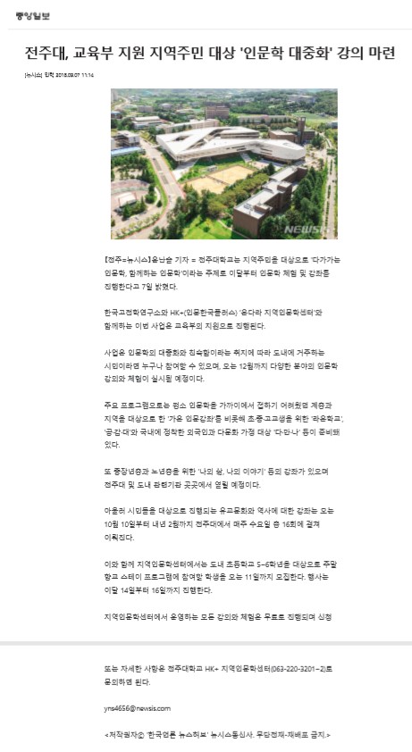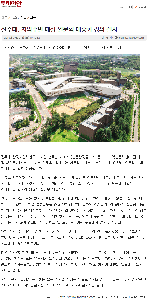 | 50 | 기타 | 전주대, 지역주민 대상 인문학 대중화 강의 실시 | 온다라 지역인문학센터 | 19-08-06 | 239 |