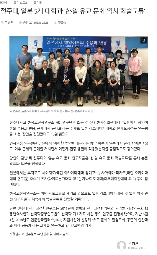 | 51 | 기타 | 전주대, 일본 5개 대학과 '한·일 유교 문화 역사 학술교류' | 온다라 지역인문학센터 | 19-08-06 | 255 |