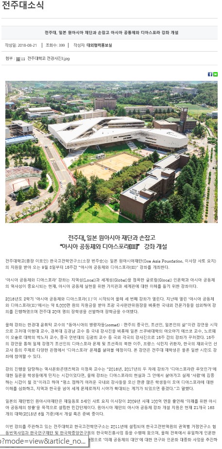 | 57 | 기타 | 전주대, 일본 원아시아 재단과 손잡고 아시아 공동체와 디아스포라 강좌 개설 | 온다라 지역인문학센터 | 19-08-08 | 251 |