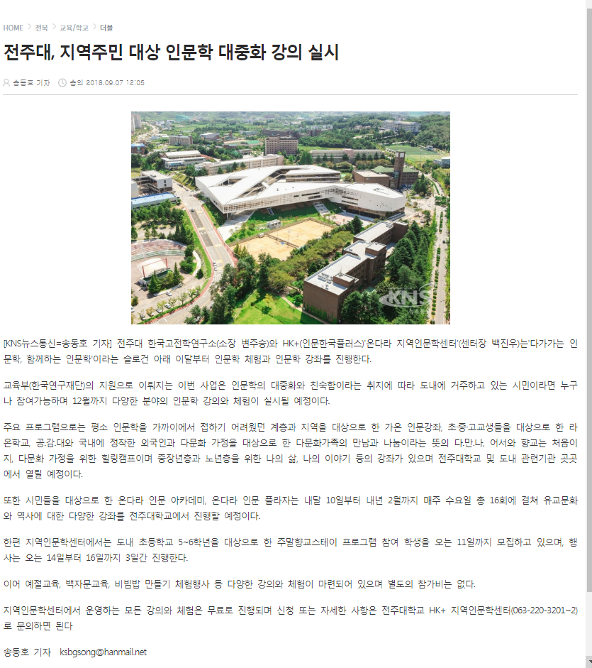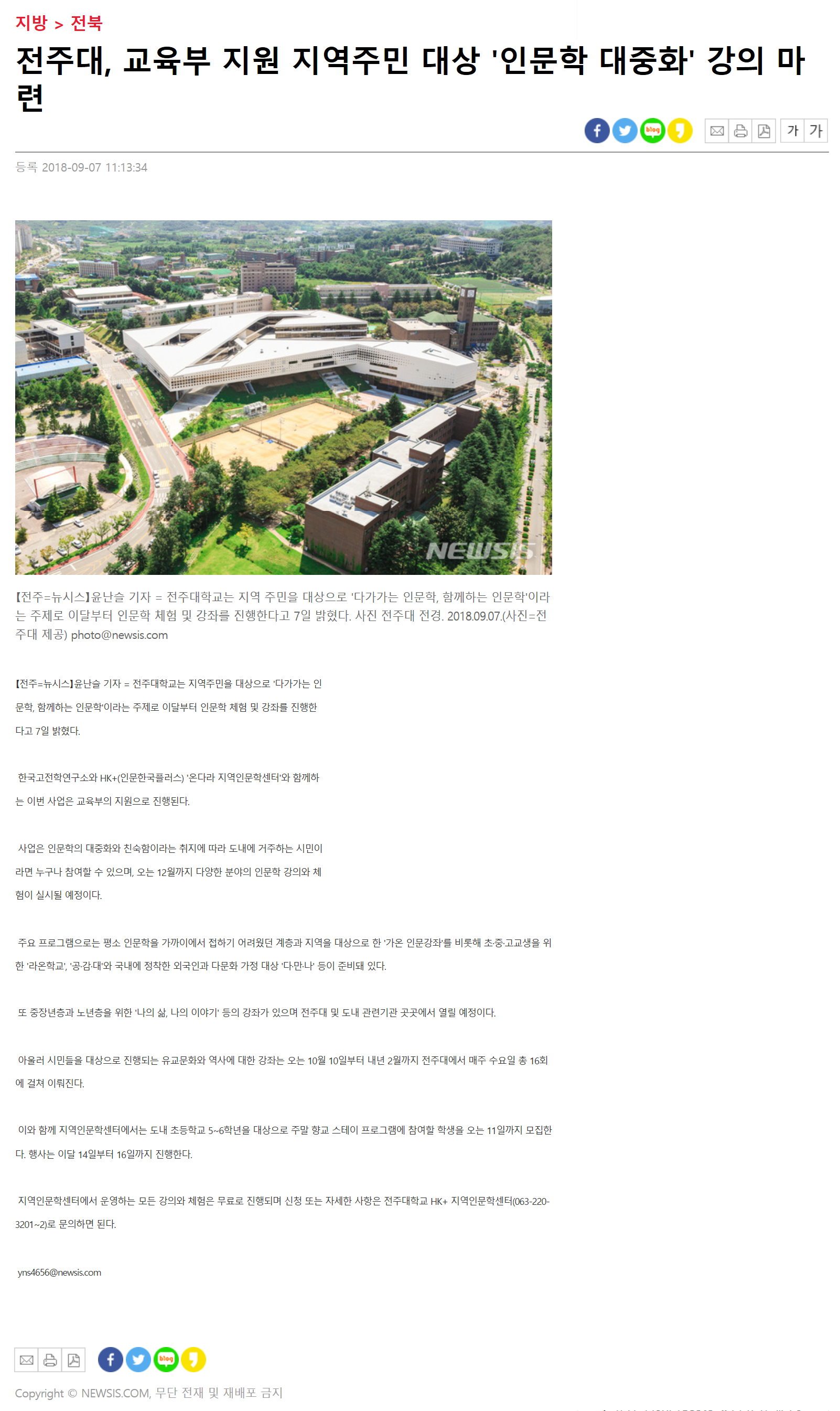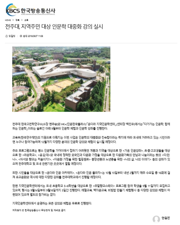| 43 | 기타 | 전주대, 지역주민 대상 '인문학 대중화' 강의 마련 | 온다라 지역인문학센터 | 19-08-05 | 308 |