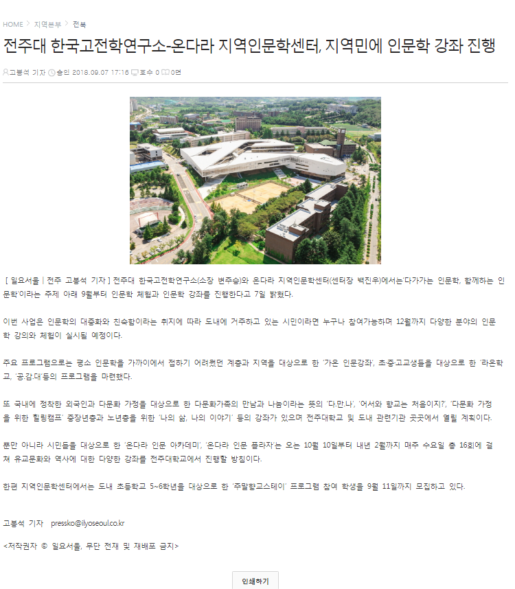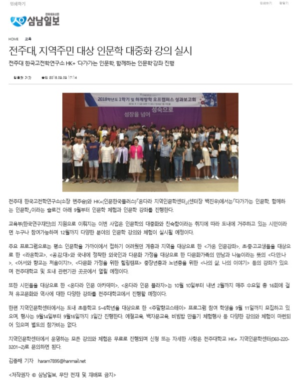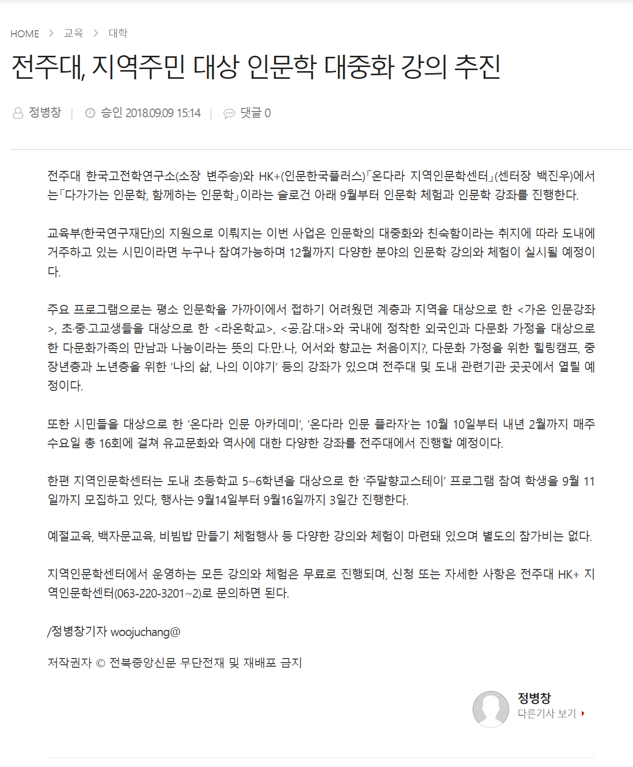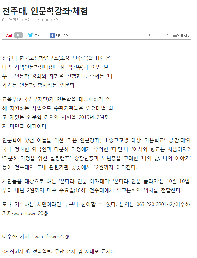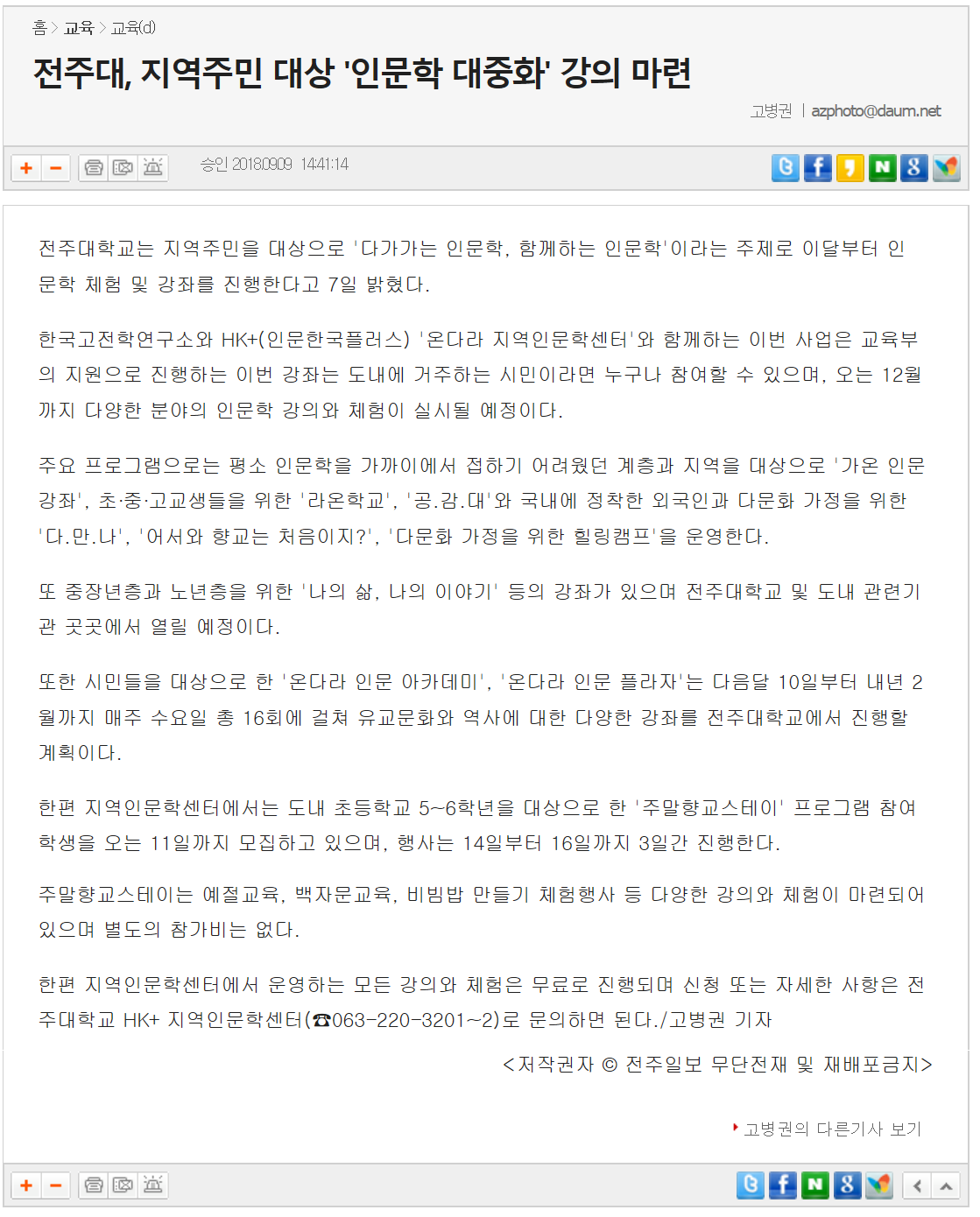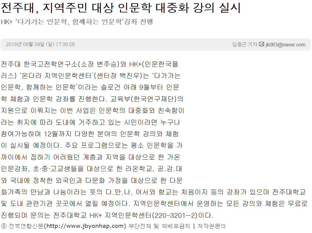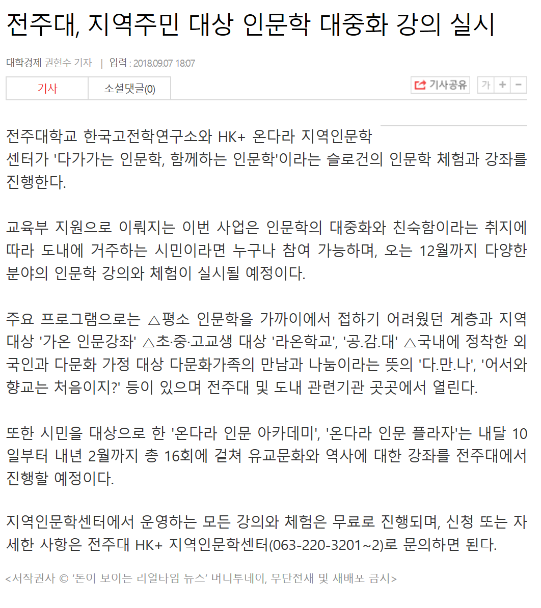 | 40 | 기타 | 전주대 한국고전학연구소-온다라 지역인문학센터, 지역민에 인문학 강좌 진행 | 온다라 지역인문학센터 | 19-08-05 | 244 |
